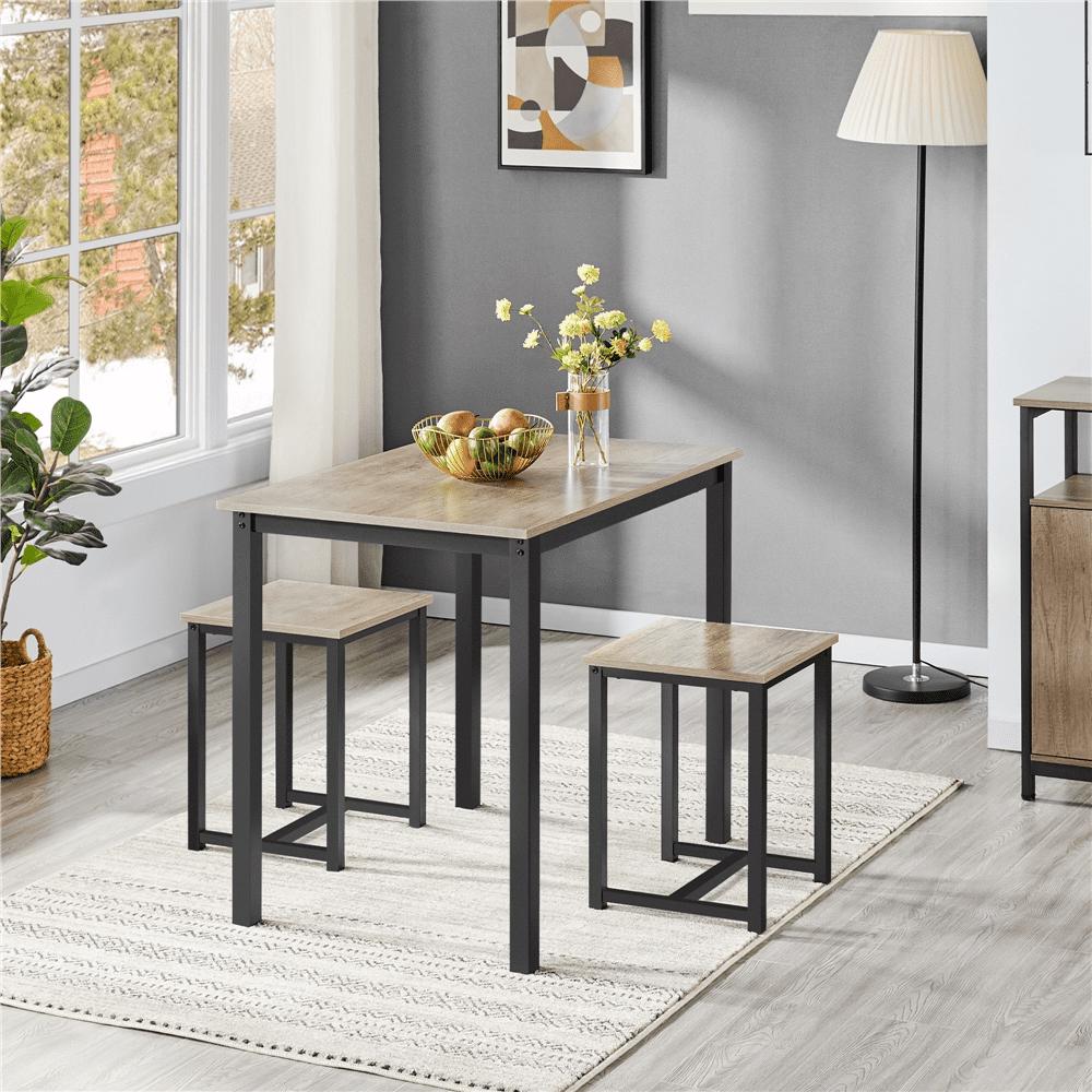 This rectangular 3-piece dining set could be the perfect space-saving solution for any kitchen, dining room, foyer, or den. The set is made of premium engineered wood and a solid iron frame, Featuring a rectangular shape, this kitchen table set could perfectly fit into any narrow space. It can be used as an island for meal prep, a simple dining table for two people, or a table&chair set for study or work.Two backless stools could be hidden underneath for better utilizing the living space. And you can sit in any direction, and the footrest at the base provides extra comfort while seated. This set has a warm, industrial style, but the sleek and clean lines give it a modern look as well. This 3-piece dining set perfectly combines practical use and a stylish look. Each set includes 1 table and 2 stools, which is great for the dining room, kitchen, living room, bar, home office, apartment, etc.