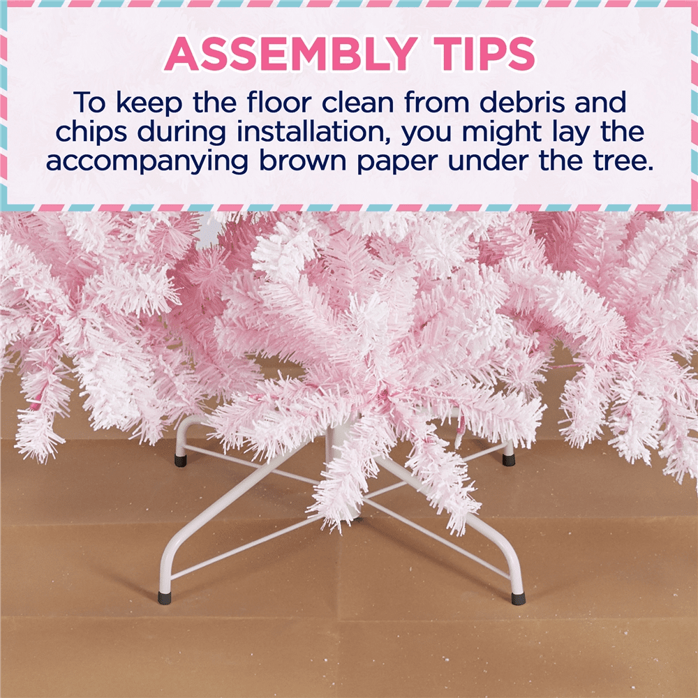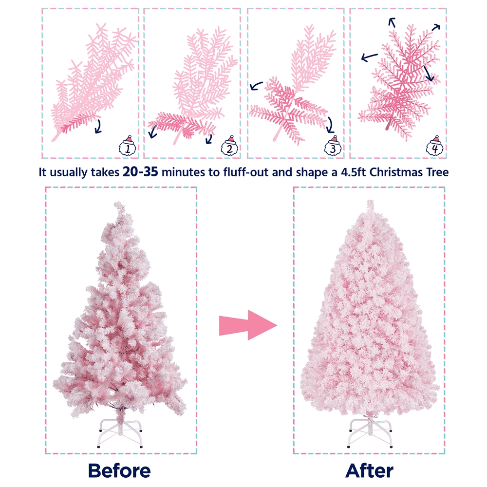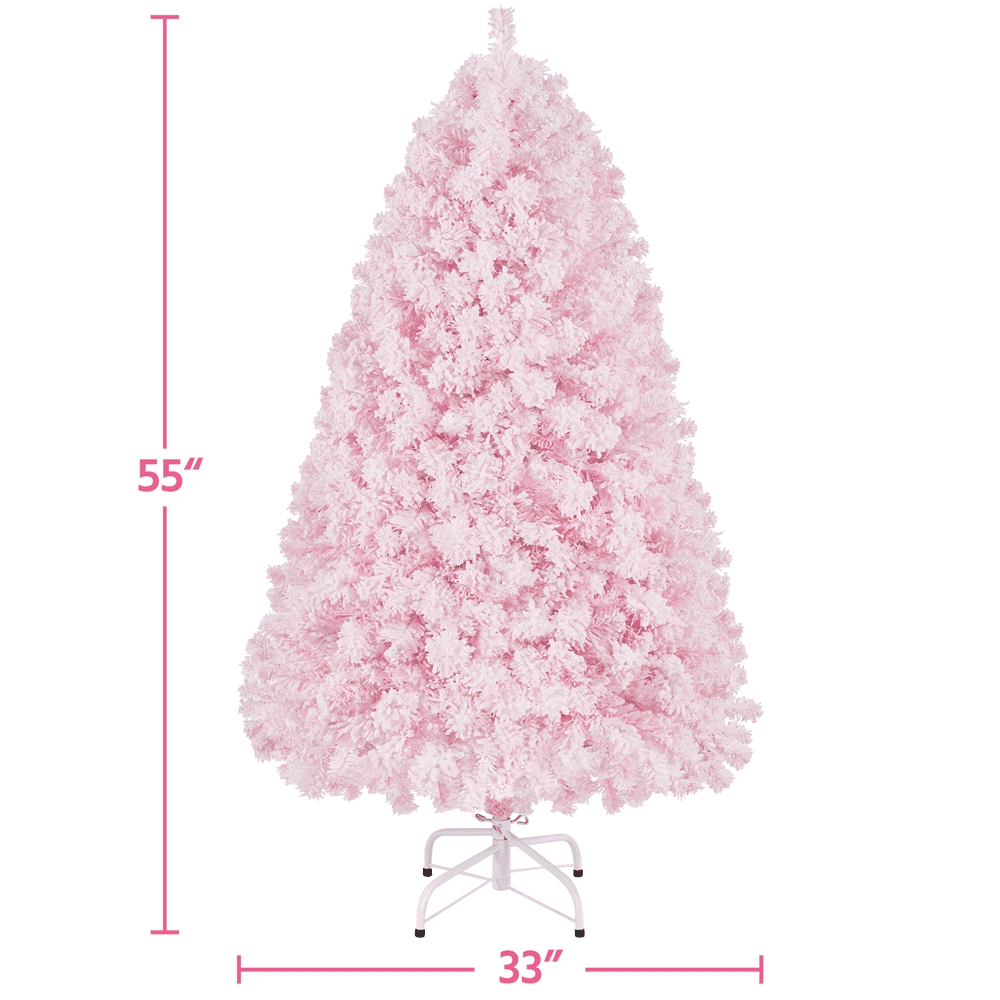 Alden Design 4.5’ Pre-lit Flocked Artificial Christmas Tree with 100 Incandescent Warm White Lights, Pink Materials: PVC, Iron Type: Pre-lit Flocked Spruce Total Tips Count: 340 Total Lights Count: 105 (include 5 replaceable lights) Light Tone: Warm Color: Pink Overall Dimension: 33×55’’(Dia.× H) Stand Dimension: 15.7×5.5’’ (Dia.× H) Gross weight (product in the box): 13.2 lb Net weight (assembled product weight): 9.7 lb Note: 1. Please allow ±1.2’’ measurement error due to the bendable branch tips. 2. Please allow ±1.1lb measurement error. Assembly Required Resdential Use