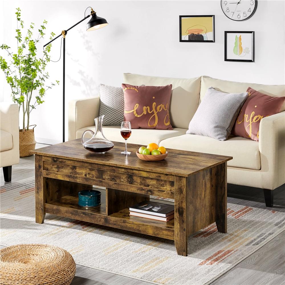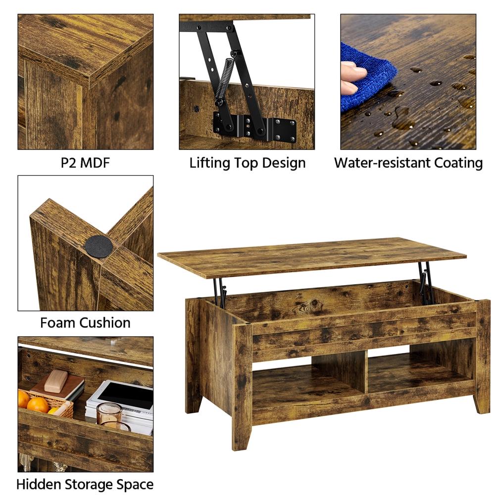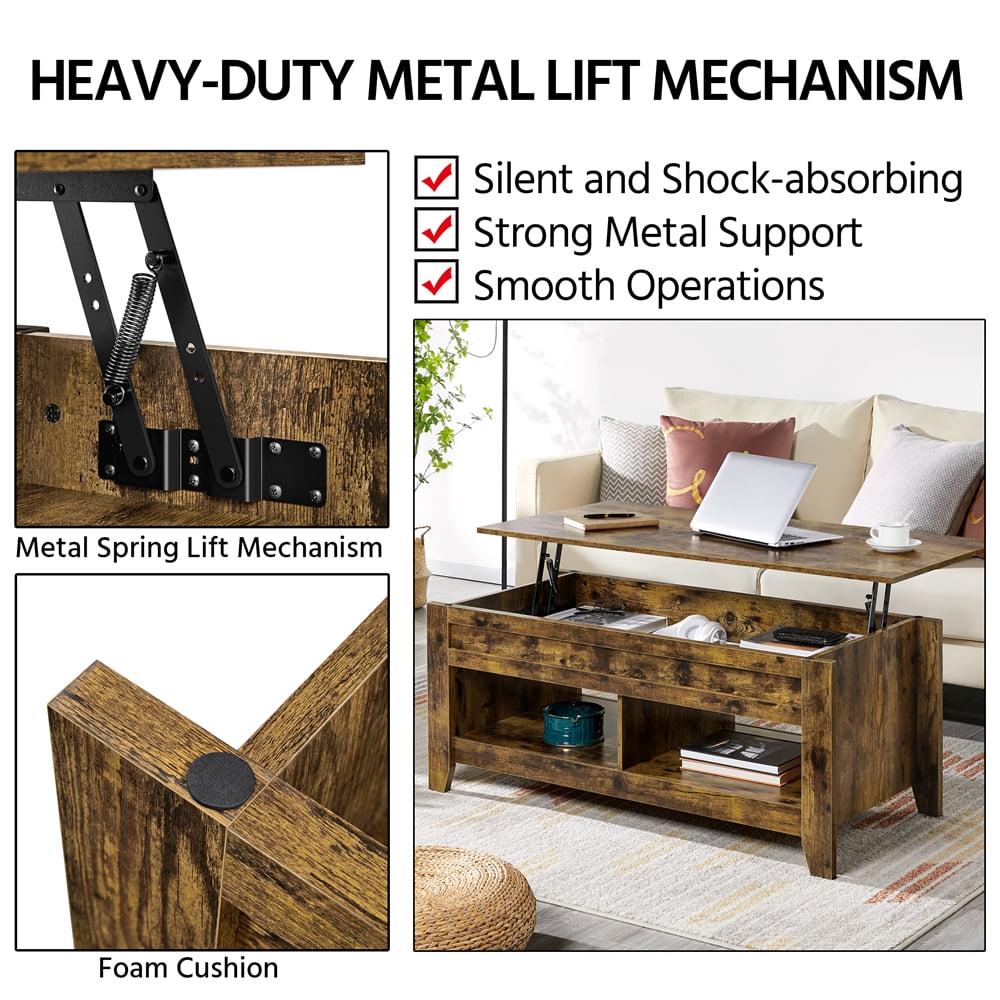 The tabletop can be lifted and moved forward to create a decent space of L120 x W60 cm/ L47.5 x W23.5 for work or dine. The metal adjustment mechanism helps lift the tabletop from 49cm/19.5 to 62cm/24.5 easily and without noise. A storage compartment concealed under the top keeps your everyday items like laptop, game controllers and suchlike handy yet out-of-sight when not in use. Two bottom open shelves provide more room for storing and displaying.Fully covered with water-resistant laminated surface, this lift-top coffee table can be cleaned with water and a mild cleanser and the table will be new again. Foam pads included, you can attach them between the tabletop and legs as bumpers, which can protect the tabletop and ensure a silent and safe operation to boot.