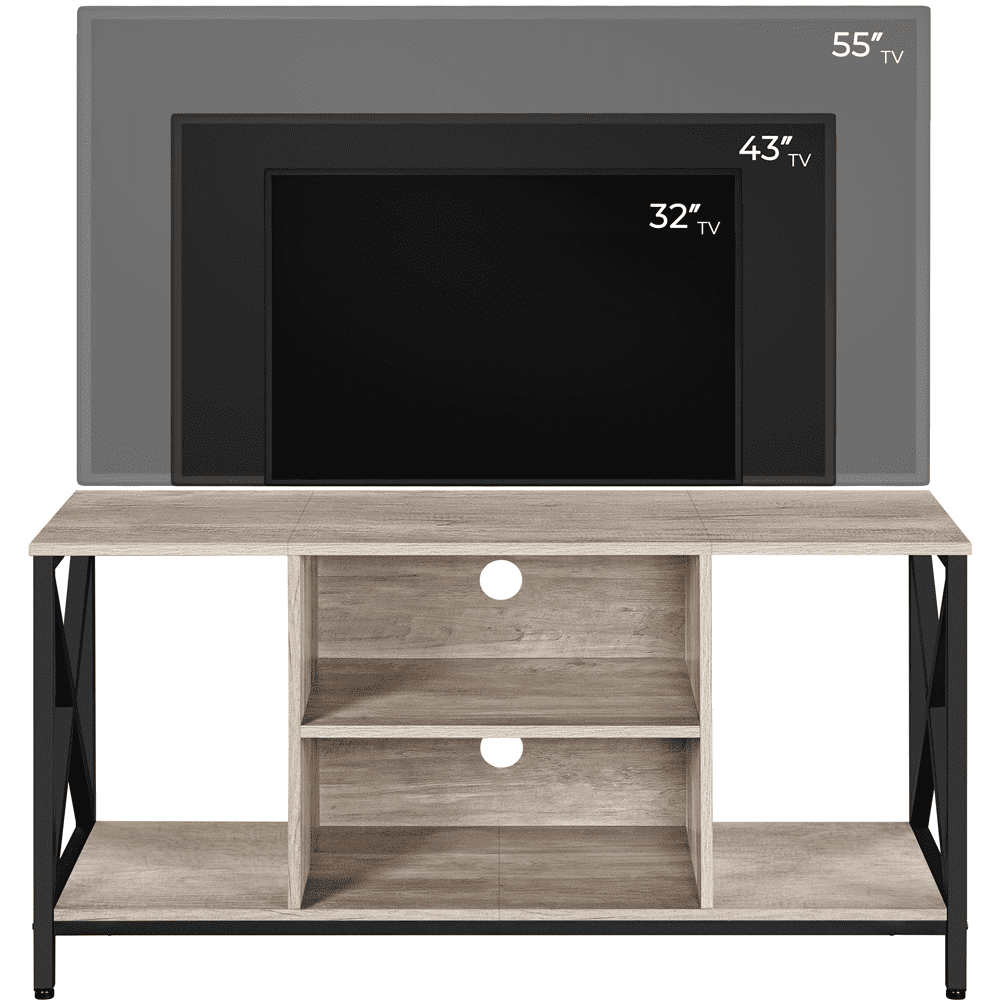 SmileMart 47inch Industrial Wooden TV Stand with Storage for Living Room, Gray Color: Gray Materials: Particle Board, Iron Overall Dimensions: 47″ L × 16″ W × 24″ H Tabletop: 47″ L × 16″ W Shelf (ea.): 20″ W × 15.2″ D × 9″ H Open Side Cabinet (ea.): 11.8″ W × 15″ D × 20.3″ H Ground Clearance: 3.3″ Max Weight Capacity: tabletop: 88 lb shelf: 22 lb each open cabinet: 22 lb Gross Weight (product in the box): 51 lb Net Weight (product assembled): 46 lb Note: Please allow ± 0.5″ measurement tolerance.