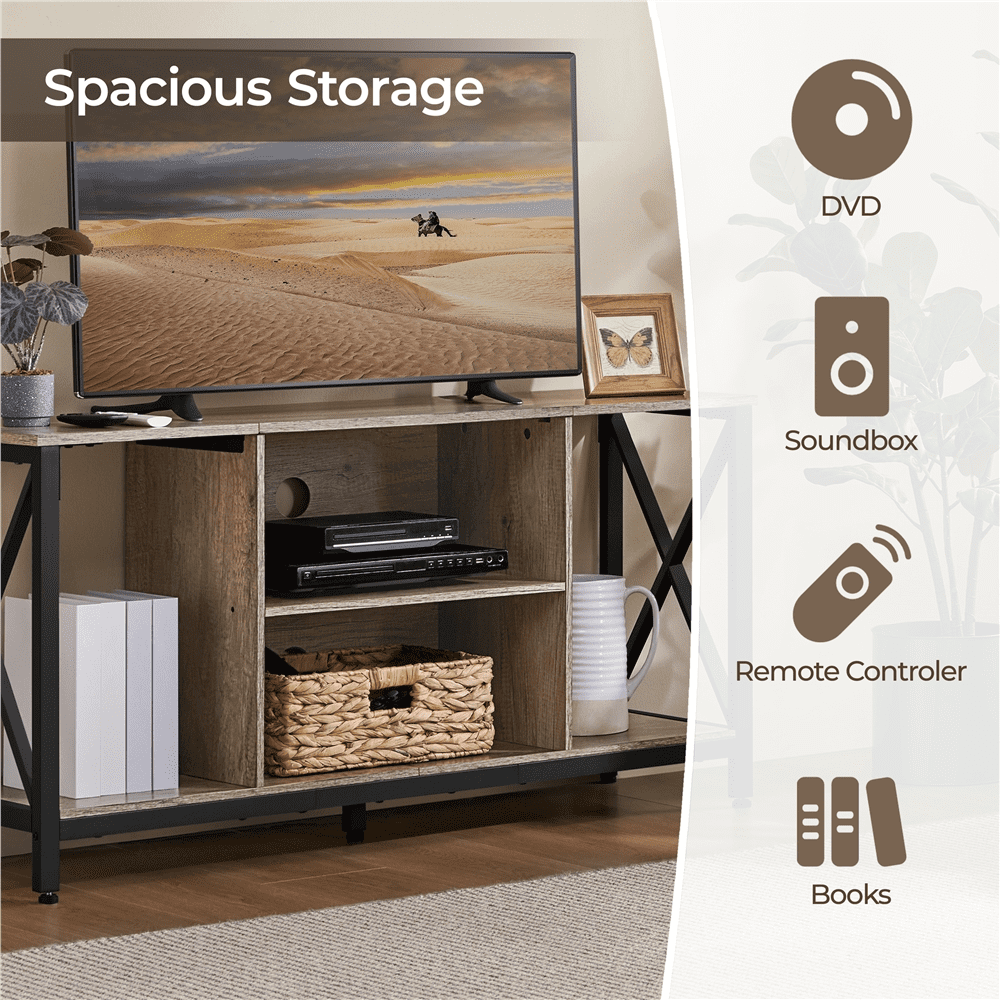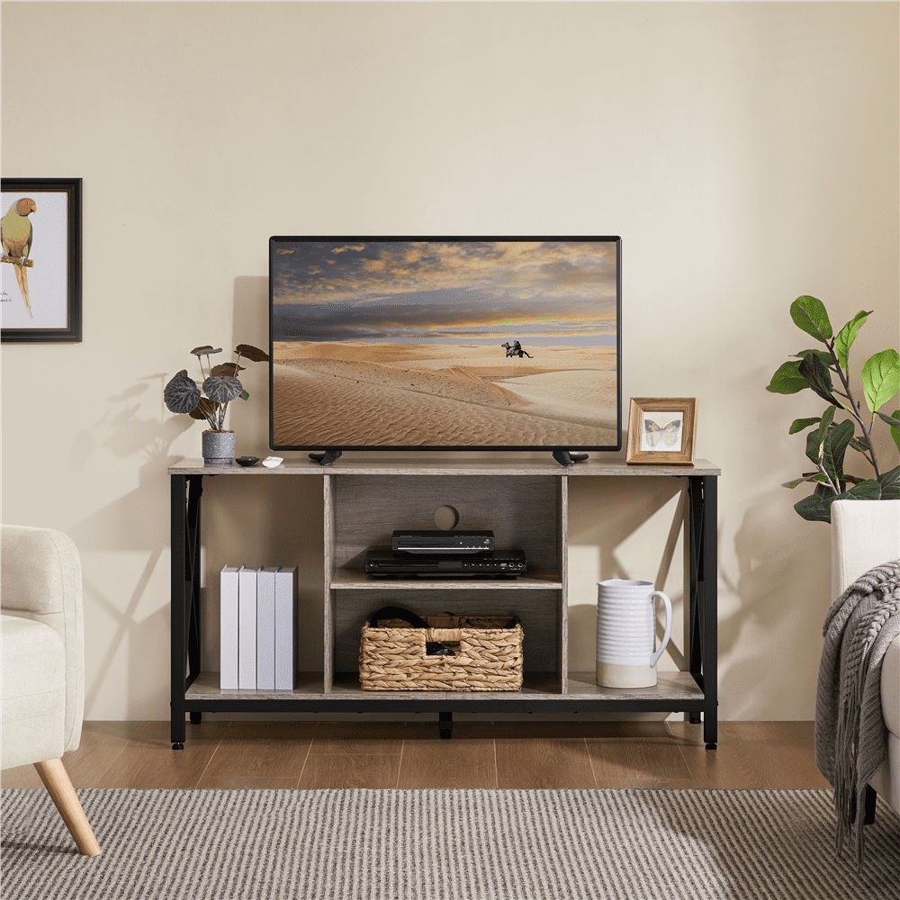 With stylish design and function harmoniously blended, this industrial TV console table can serve as a tasteful addition to your house and provide ample storage space to meet your storage needs. Crafted from powder-coated metal and engineered wood, combined with a matte metal framework, this media entertainment center features vintage and industrial elements, allowing it to well integrate into various room decors. The 47″ long 16″ wide tabletop provides ample space for a 55-inch TV, and the 4 open storage compartments provide enough space for storing your items like CDs and game collections. Besides, with a whole set of the required components, hardware and detailed instructions, assembly turns out to be pretty simple.