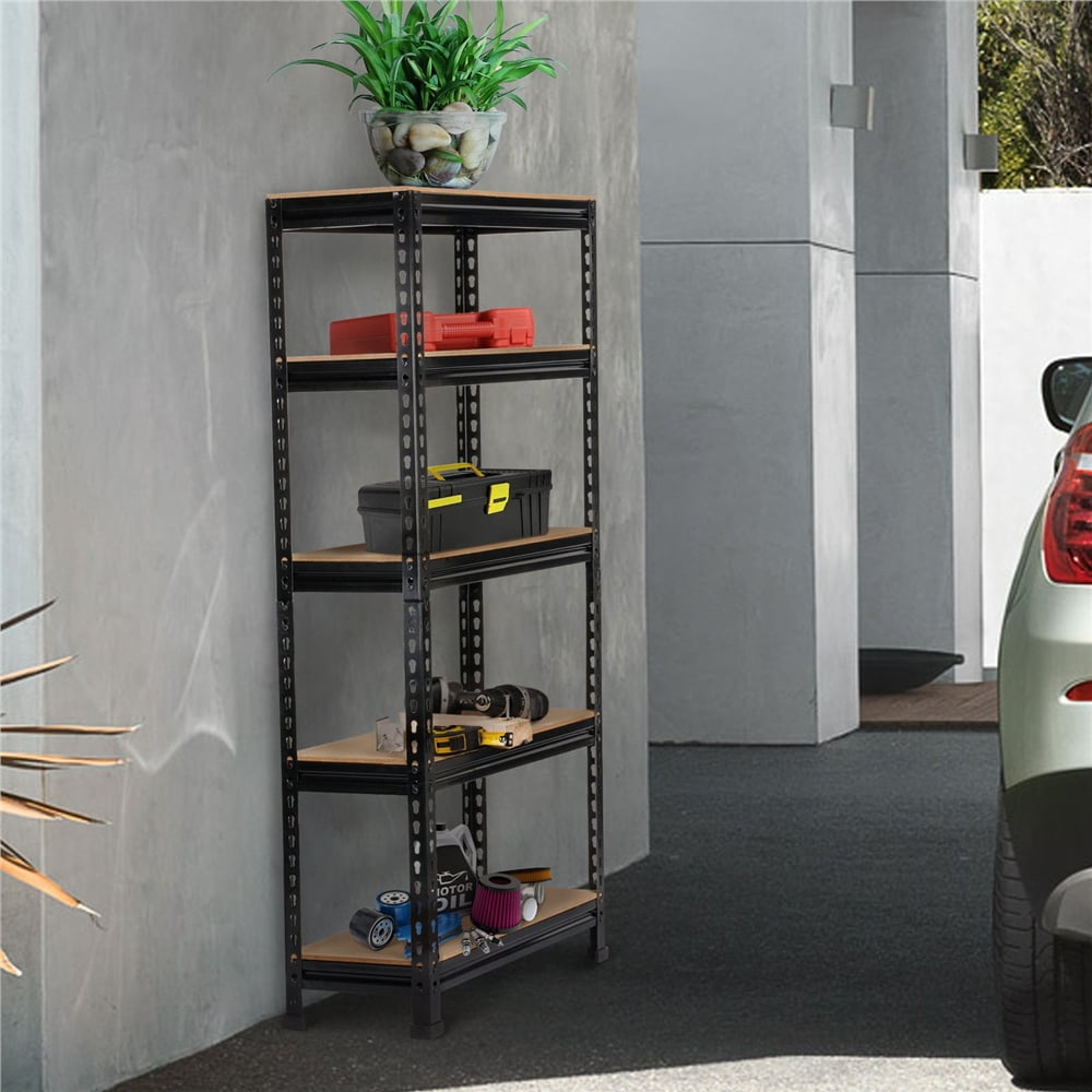 This boltless storage shelf is a very universal and strong garage shelf. Boltless design is for convenient assembly. This 5-tier rack is supported by a galvanized, strong metal frame. The powder-coated surface treatment gives it a textured look and water and scratch-resistance, ensuring it keeps as good as new without peeling off or oxidation after long-time usage. This 5-tier storage rack is constructed of a high-quality steel frame and CARB P2 MDF board, capable of firmly holding up to 330 lb. The 5 shelves of this rack are all adjustable for getting items in different sizes well-settled. In addition to vertical assembly, you can also put this rack together into your needed form. Such flexible designs maximize the usage of this rack to its greatest extent.Comprising 5 adjustable tiers, each of which measures 27.2″ L × 11.5″ W. This rack can accommodate most of the daily used items at home, or goods in supermarkets, warehouses, and anywhere with storage needs.