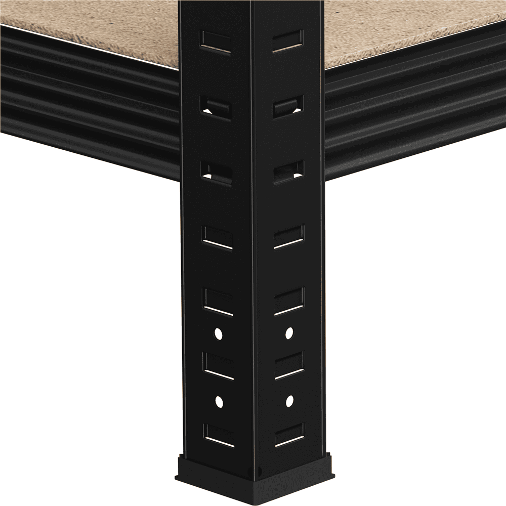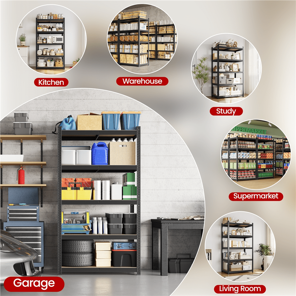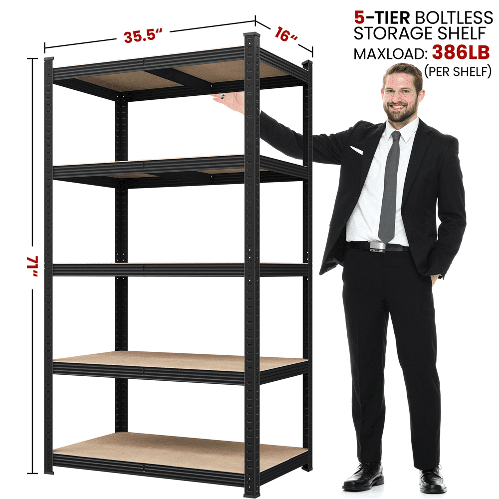 Robust Metal Frame: This 5-tier rack is supported by a galvanized metal frame. The powder-coated surface treatment gives it a textured look and water and scratch-resistance, ensuring it keeps as good as new without peeling off or oxidation after usage. Flexible Storage Solution: With 5 adjustable shelves, this rack can accommodate items of various sizes. Its modular design allows for both vertical assembly and customized configurations, optimizing its utility. Enhanced Assembly Solidity: Featuring upgraded protrusions on the connecting crossbars, this design ensures a tighter clip fit during installation, boosting overall stability and strength. Versatile Applications: These storage racks are highly adaptable and perfect for various settings. They effectively help you declutter and organize your space, making them suitable for kitchens, bathrooms, bedrooms, living rooms, warehouses, offices, commercial exhibitions, hotels, supermarkets, and more. Specifications: Color: Black; Material: MDF Board & Powder-coated Iron Frame; Assembled Dimensions: 35.43 x 15.75 x 71.06 inch; Max. Weight Capacity (per tier): 386 lb; Total: 1925 lb; Shipping Weight: 31.5 lb; Item Weight: 29 lb.