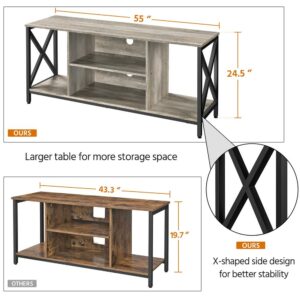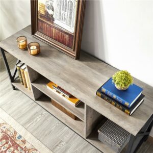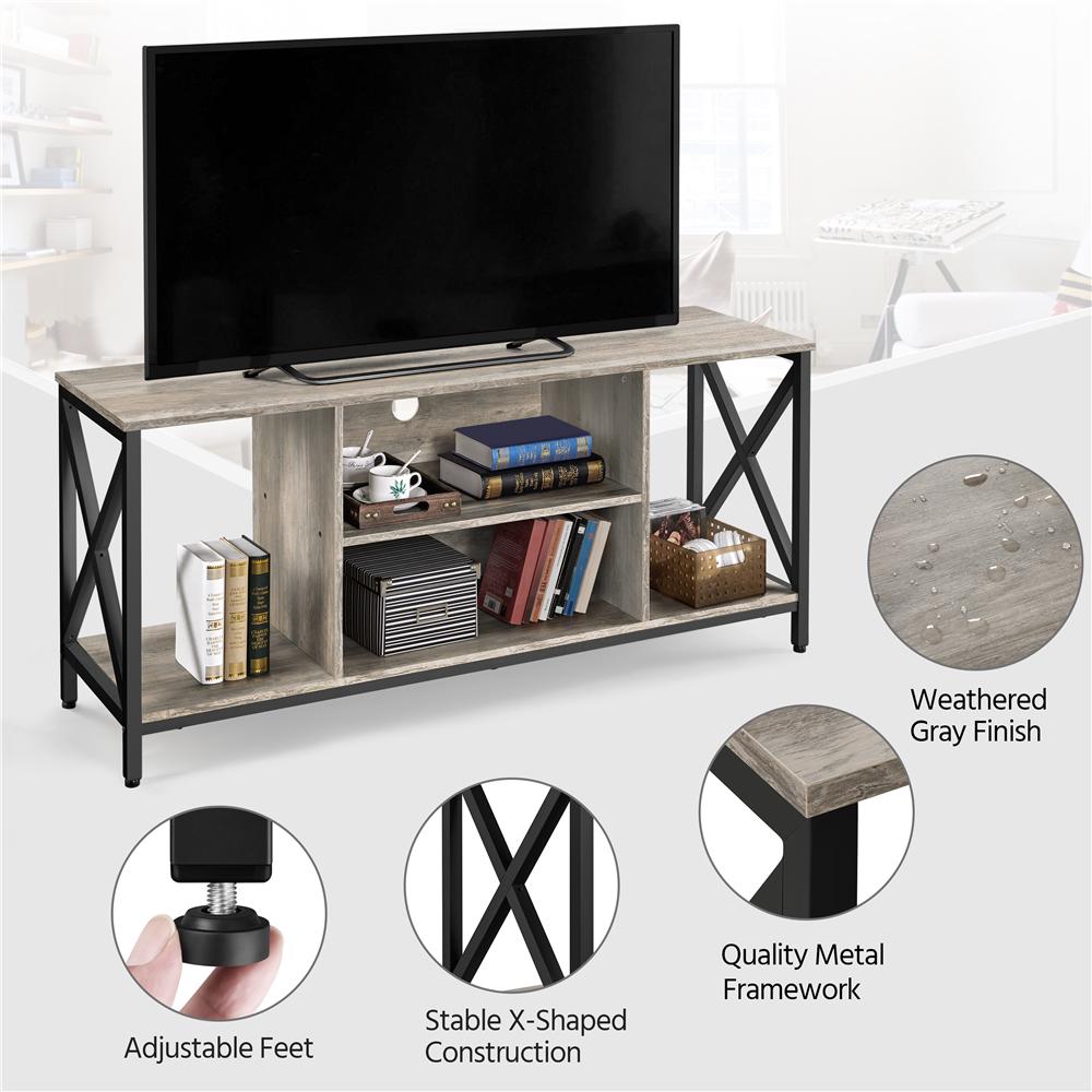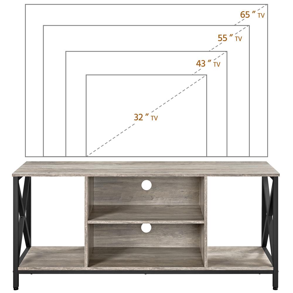 This accent TV console table adds an abundance of style and storage to your living room, bedroom and great room. Crafted from powder-coated metal and CARB P2-compliant engineered wood, this sturdy TV console features a matte metal framework that lends a typical industrial feel, while the distressed wood grain finish adds rustic appeal. The 140cm/55 long 40cm/16 wide tabletop provides generous space for TV s up to 60-inch, and the 4 open compartments give sizable room for your devices and CDs and game collections. The two cord outlets help gather and organize the cords. Simple assembly is required for this TV console table.