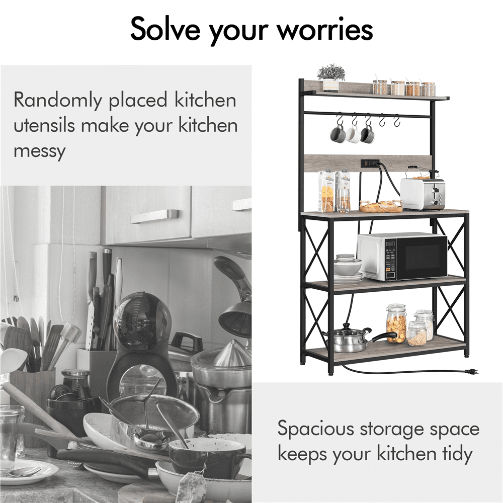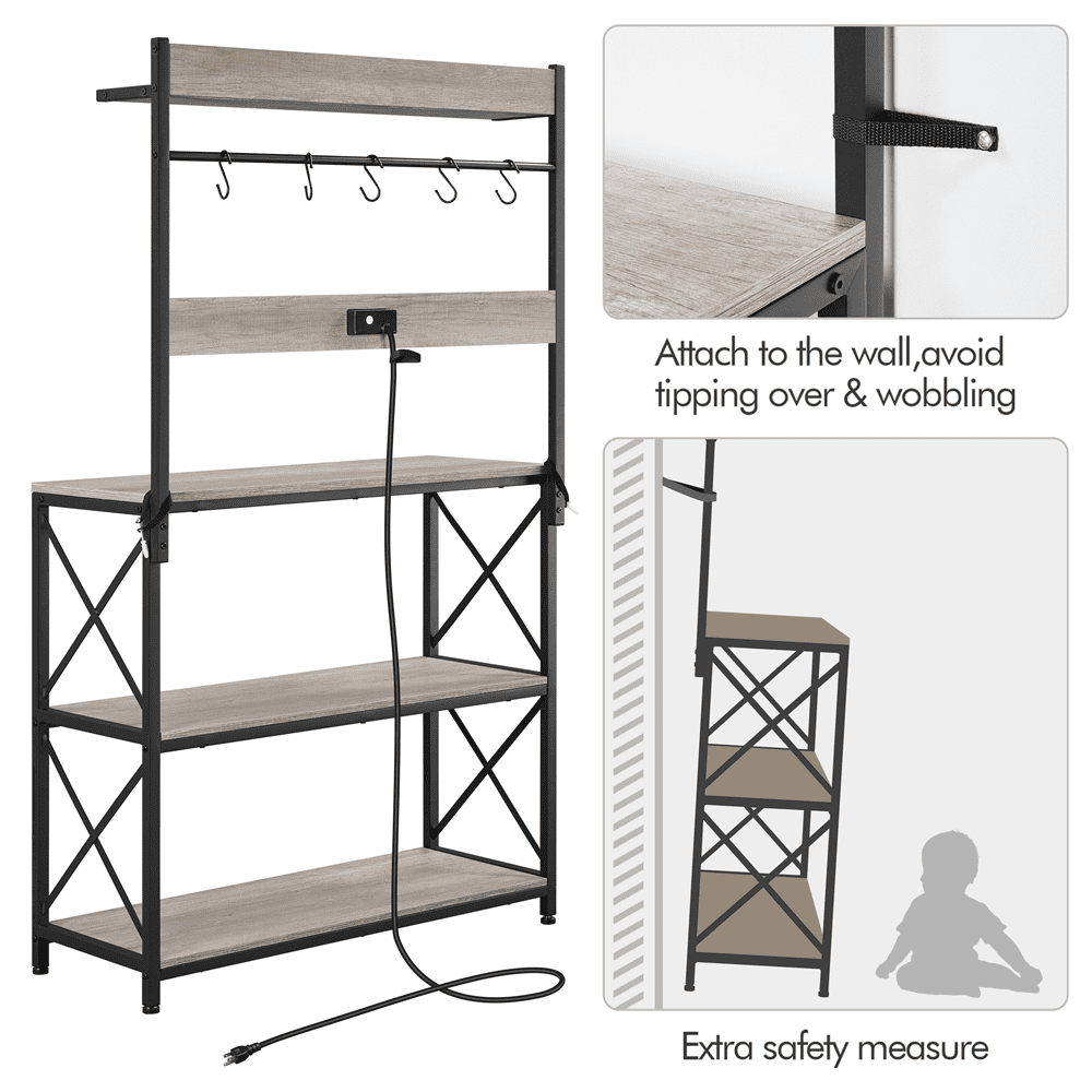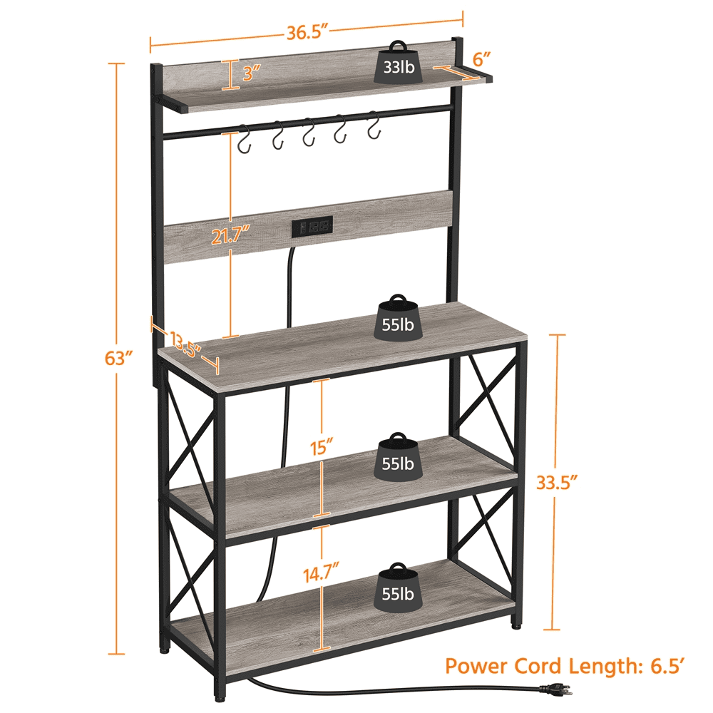 Alden Design 63″H Kitchen Baker’s Racks with 2 AC Outlets for Kitchens Living Rooms, 4-Tier, Gray Color: Gray S-shaped Hook Quantity: 5 Materials: Engineered Wood, Metal Power Outlet: 2 AC Outlets with a Switch Power Cord Length: 6.5′ Power Cord Type: Double-Insulated Round Cable Overall Dimensions: 36.5″ L × 13.5″ W × 63″ H Countertop Height: 33.5″ Countertop: 36.5″ L × 13.5″ W Upper Shelf: 34.6″ L × 6″ W Lower Shelf (each): 34.6″ L × 13.5″ W Distance Between Shelves (from top to bottom): 26.2″; 15″; 14.7″ Net Weight (assembled product weight): 40.5 lb Gross Weight (product in the box): 44.5 lb Maximum Weight Capacity (from top to bottom): Upper Shelf: 33 lb Countertop: 55 lb Lower Shelf (each): 55 lb Hook (each): 5.5 lb Note: 1. Please allow a 1/2″ measurement tolerance. 2. Please do not overload the product. 3. Please do not stand or sit on this item. Residential Use Assembly Required