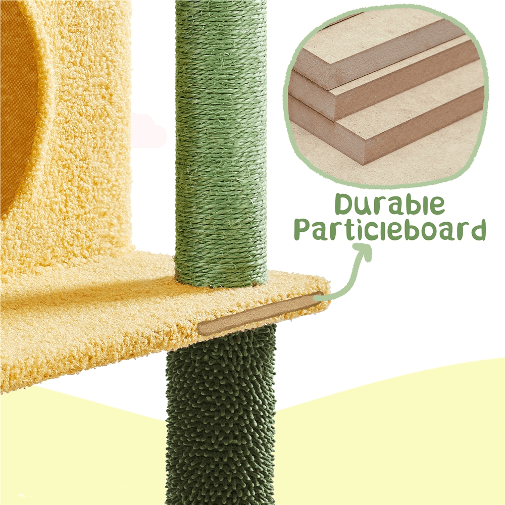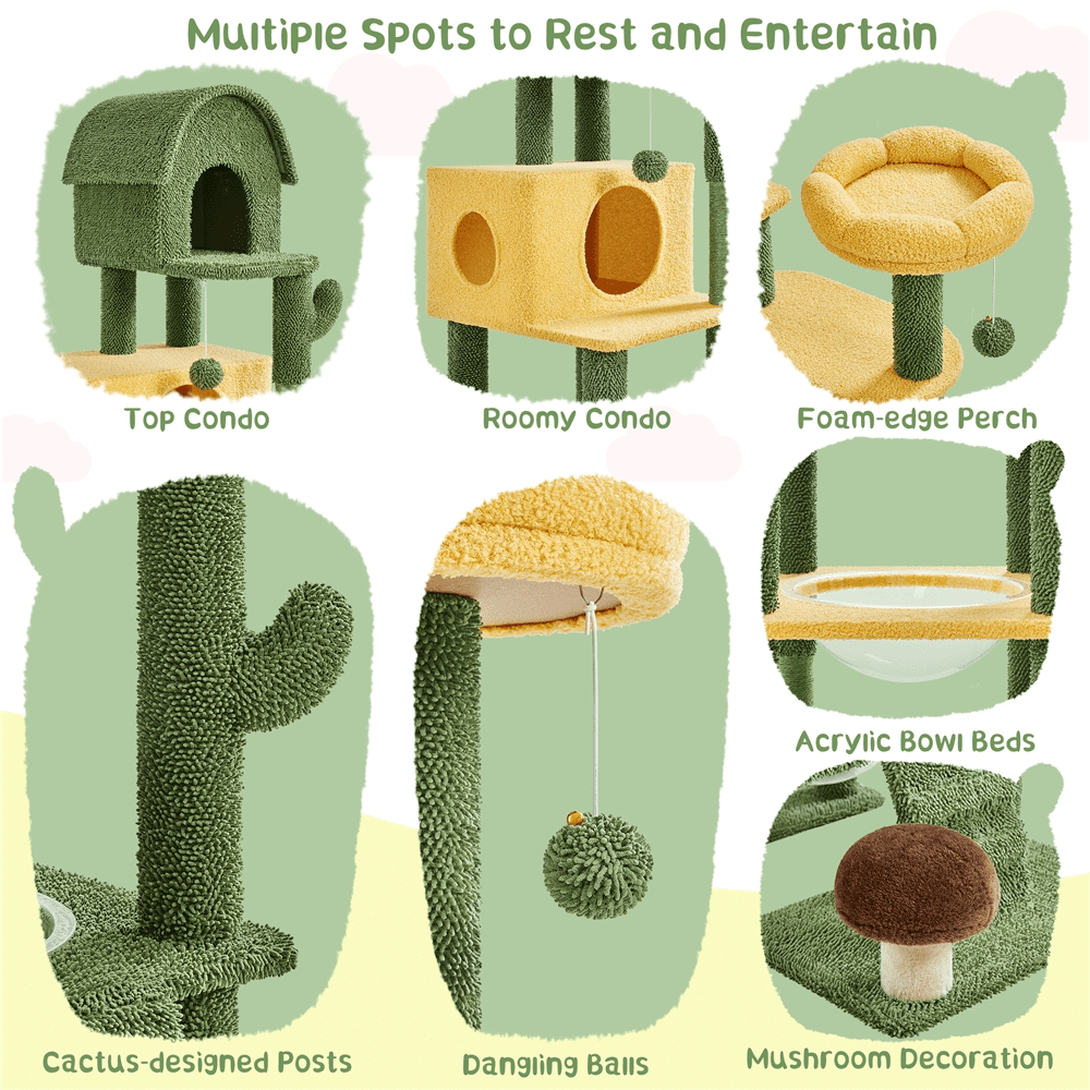 Who can resist the charm of a cat or the allure of a refreshing oasis? But what if you could combine the two? Introducing our incredible Oasis-themed cat tree series! The vibrant color palette of yellow, green, and brown of this 68.5″ tall cat tree tower instantly evokes images of delightful oasis views. And the intricate cactus, flowers, and mushroom designs truly bring the theme to life. This cat tower features a flower-designed perch with a plush foam edge, an extra-large condo, a cute little “penthouse,” and two acrylic bowl beds, providing multiple lounging/napping spots for your feline companions to unwind and bask in the sun. Better yet, the multi-level layout, complete with scratching posts and dangling toy balls, creates an engaging and entertaining environment for your cats. They’ll have a blast exploring and playing, all while sharpening their claws and keeping themselves entertained. This 68.5″ tall cat tower is specifically designed for 3 to 4 medium or large-sized cats. Assembly is a breeze, so you can have your cats enjoying their new oasis in no time.