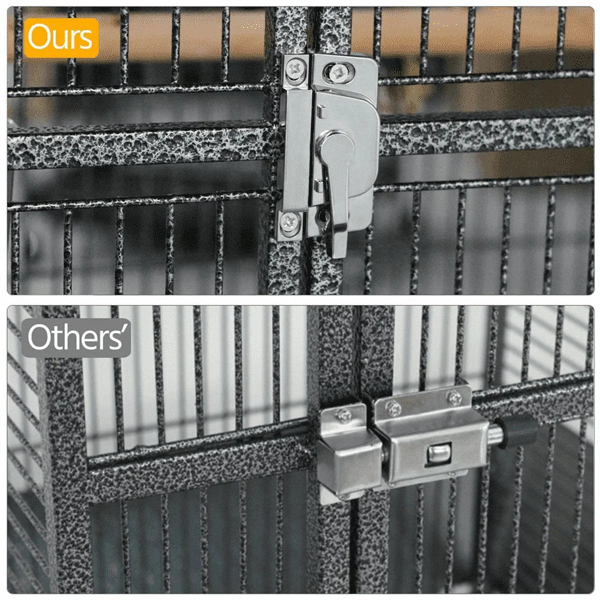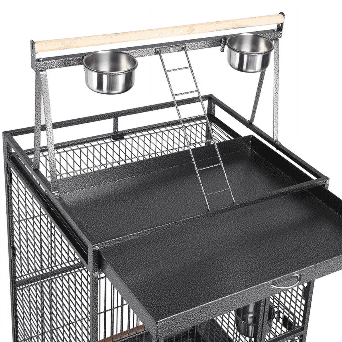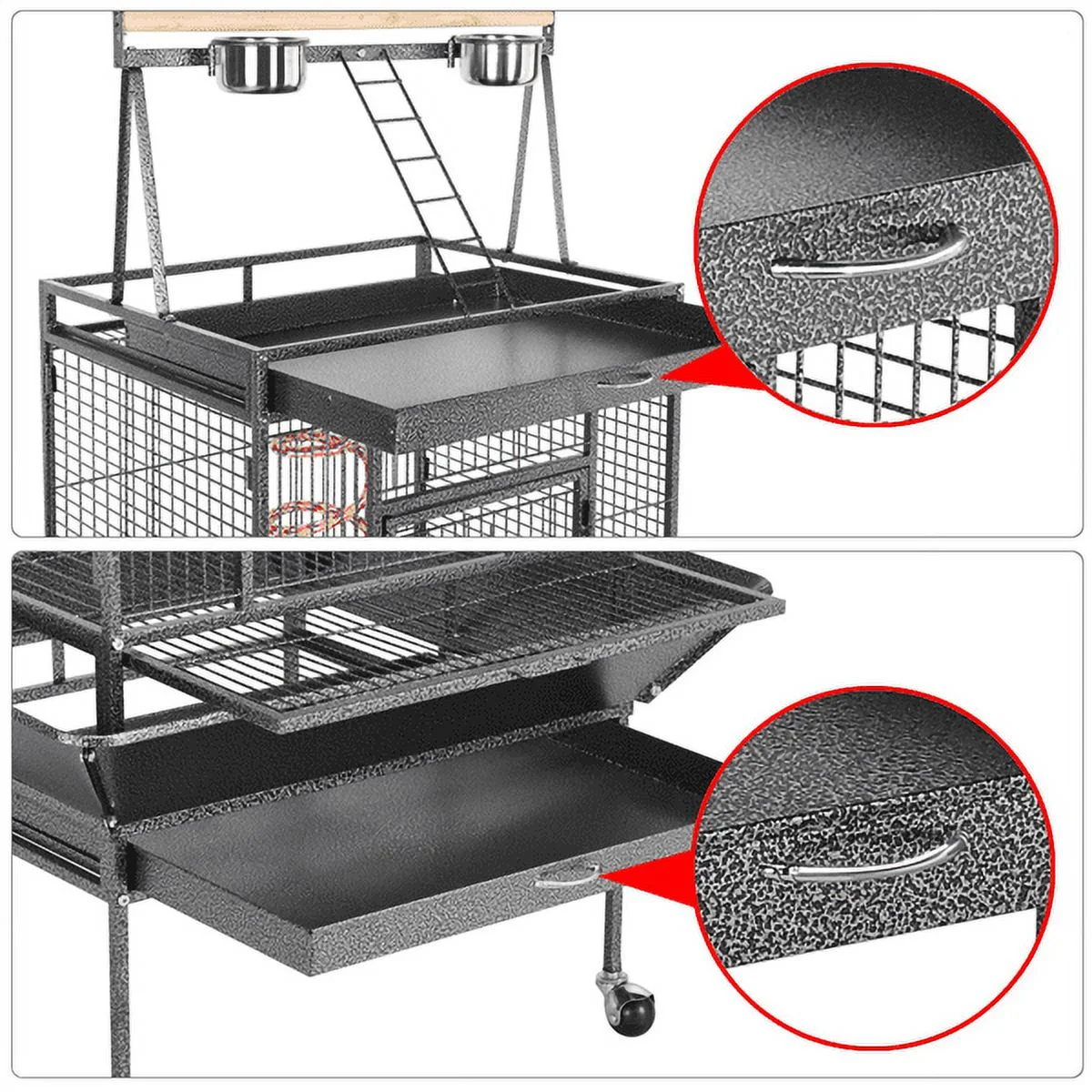 *Features: Birds’ Playground: A play top with a ladder, a wooden perch and 2 stainless steel feeders offer you a better interaction way with your beloved birds on the cage top area; a rope with bell can be fixed freely inside the cage, special gift for your playful birdies. Spacious & Secure: Large inner space able to accommodate several birds at a time. A convenient crescent lock on the entrance door for safety. Heavy-Duty & Safe: This solid metal cage is coated with non-toxic hammertone paint, which ensures its good performance in wear, corrosion and rust resistance. Polished wooden perches and stainless steel feeders offer your lovely birds a safe and healthy living environment. Slide-out Tray & Grille with Handle: A safety metal grille to prevent birds from walking directly on their dropping; a slide-out metal tray under the grille for catching droppings and feeds, and also for easy cleaning. Idea Rolling Cage: Features 4 swivel casters for smooth rolling. Suitable for housing Lovebird, Budgie, Green-cheeked, Sun Conure, Quaker, Cockatiel and other birds in similar size. Also a good temporary cage for birds like Goffin’s cockatoo, African grey and Indian ringneck. Easy to Use & Practical: Comes with all necessary tool and hardware, simple structure easy to assemble under the detailed instructions enclosed. Suitable for both home and outdoor use. Perfect choice for pet stores and pet hospitals.