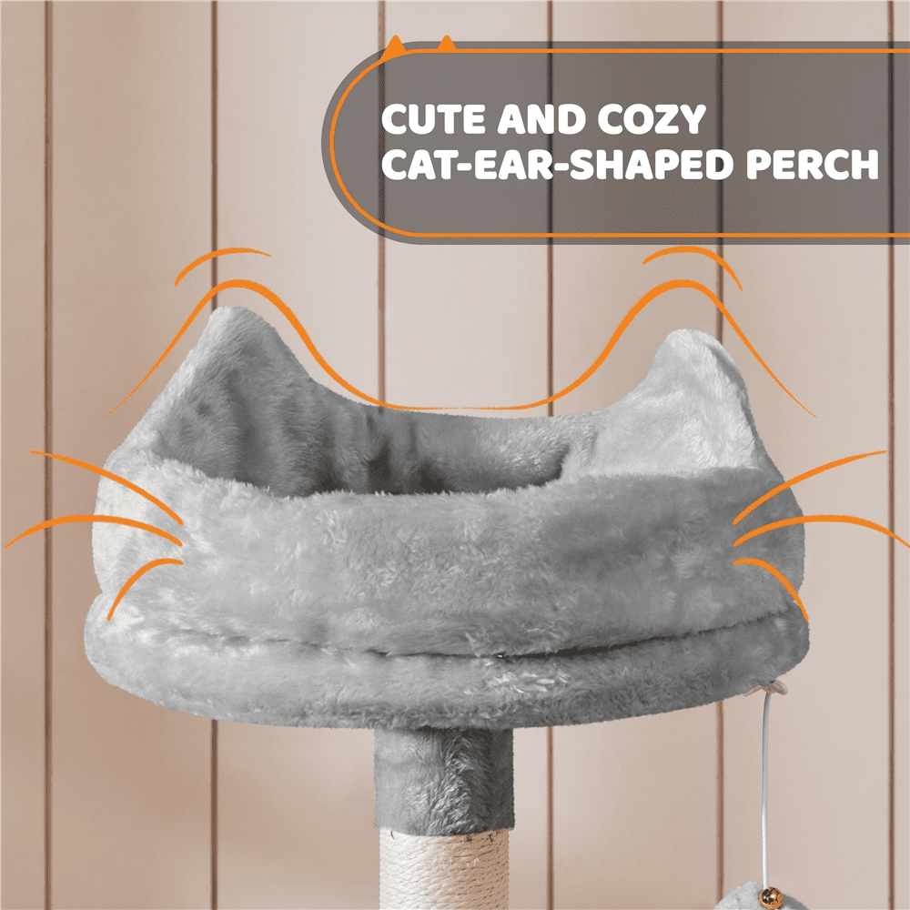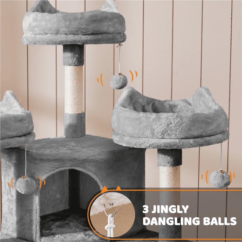 Are you looking for an ideal cat tree for your cats? Try this large plush cat tree. It won’t let you and your cats down! Our multiple-level cat tower is made from durable soft materials, particleboard, plush, metal, and plastic. Our large cat tower has a pretty appearance and reasonable layout. It can fully meet your cats’ needs for playing and sleeping and exercising. Three perched platforms at the top are designed to look funny like cats’ ears, cute, and interesting. If you have more than one cat, this large cat house is a perfect choice. It has multiple levels and layouts and functions. Simple assembly is required and a detailed manual is included. Do not miss this quality cat tree!