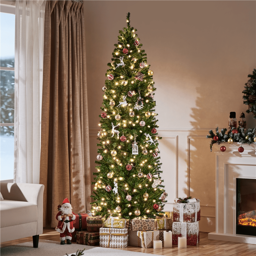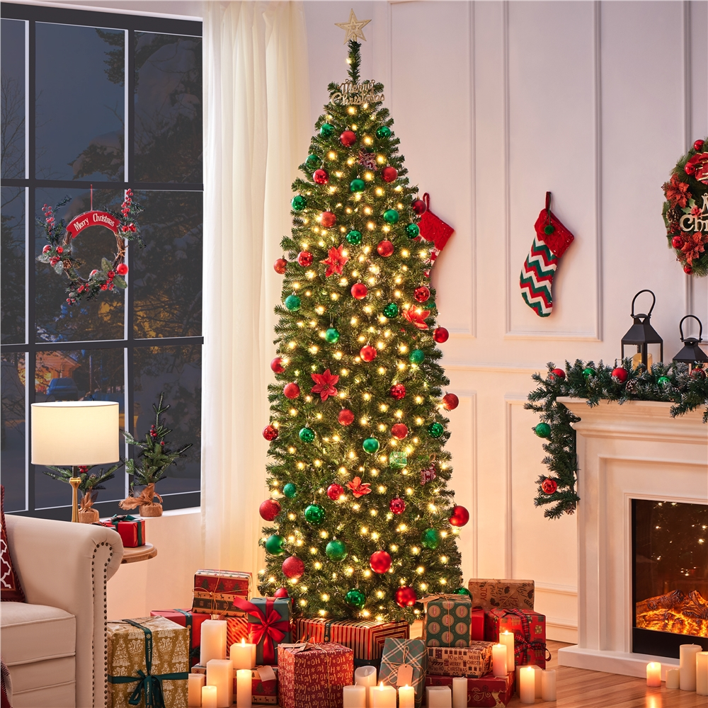 Our pre-lit slim pencil Christmas tree is ready to visit your lovely home. Horizontally small sized artificial Christmas tree is suitable for locations with limited space. A natural lifelike appearance present you with a full and fluffy feeling; Warm toned lights add extra festive atmosphere to your holiday time. Premium quality materials ensure this pre-lit pencil artificial tree durable and sturdy; Bendable branch tips are easy to lift up and down for pre-setting;