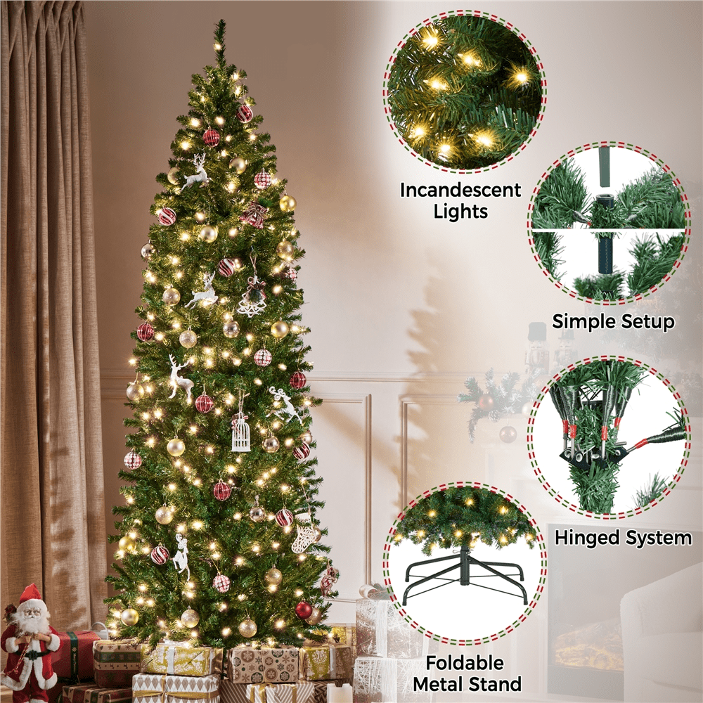 SmileMart 7.5 Ft Pre-lit Artificial Christmas Tree Holiday Decoration Slim Hinged Spruce Pencil Tree with lights,Green: Slim Pencil Christmas Tree: Slim pencil shape of the tree body makes it space-saving. This pre-lit artificial Christmas tree are hinged with plentiful tips, which give a full and fluffy look from any angles in your decorated places. Green and thick finish of branch tips enhanced the natural leafy vibe of this decorative holiday tree. Lush tips also leave more space for your other festive ornaments. Premium Quality Material: Get into the holiday joy with this lush pre-lit artificial Christmas tree. All branches and tips are made of premium PVC, which makes it harmless and durable. Both trunk and and the stand are made of iron, ensuring sturdy and balanced placing, not to mention other feathers such as fire-resistant and anti-collapse. Pre-lit Artificial Christmas Tree: This slim pencil Christmas tree come with reasonable number of lights. These clear white lights all have the same warm tone, adding delight and festive atmosphere to your sweet home. Extra lights and fuse wires are provided in the package to exchange with the old ones for long term usage. Foldable Stand: This stand is foldable for easy storage and packing, you can effortlessly fold it to save more space in garage and wait for another coming year. Four feet of the stand are covered by non-skid rubber each to make sure the tree is sturdy, also preventing from floor scratches. Versatile Design: Our pre-lit pencil artificial tree can be used either indoor or outdoor, the sturdy metal frame is relatively heavier and not likely to collapse. Pencil shaped Christmas tree takes less room, suitable for places where the space is limited. It is a pre-lit tree with no decoration on it except for branch tips and warm lights. We hope you can enjoy a sweet fun time decorating this full and fluffy tree with your kids, family and beloved ones. Flexible tips: The “leaves” on our tree can be bent and set at will. After putting the tree body and the stand together, you are supposed to fluff out the tips to give a full look of your unique Christmas tree. All tips are bendable and can be set in a certain direction, normally the fluffing out procedure including two steps: lifting up the top tips and pulling out the side tips. Easy to Set Up: Our tree is made based on hinged system, the tree body is divided into 3 sections with label on them. You could set up this tree by simply insert one of tree parts on another. The stand can also be effortlessly folded out and connect to tree body with screws. It is suggested to wear gloves while setting up and fluffing out, just like a real spruce, the “needles” can be a bit scratchy. *Specification: Materials: PVC, Iron Categories: Pencil Unlit Spruce Total Tips Count: 1086 Total Lights Count: 350 Light Tone: Warm Tone Overall Dimension: 82×228cm/32.5×90’’(Dia. × H) Shipping Dimension: 110.5×26.5×28.5cm/43.5×10.5×11.2’’ Stand Dimension: 55.5×17cm/22×6.7’’(Dia. × H) Tree Trunk Diameter: 32mm/1.3’’ Trunk Pole Thickness: 0.7mm/0.03’’ G.W.:12.2kg / 26.9lb ; N.W.:10.6kg / 23.4lb Color: Green Please allow ±3cm/1.2” measurement error due to the bendable branch tips. Please allow ±500g/1.1lb measurement error