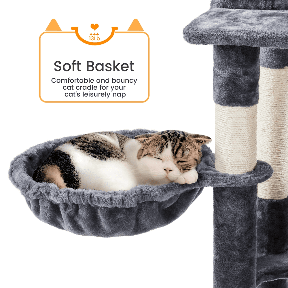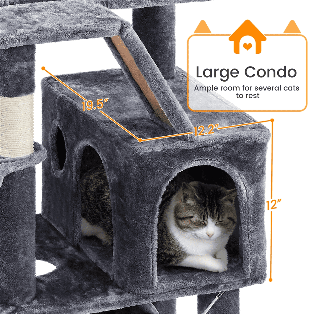 Alden Design 71″ H Multi-Level Large Cat Tree with 2 Cozy Perches 2 Condos,Dark Gray Color: dark gray Material: particle board,plush & sisal rope Overall dimension (approx.): 24 ” L x 19 ” W x 71 ” H Top perch sizee:: 14 ” L x 14 ” W x 3.3 ”H Big condo size (approx.): 19.5 ” L x 12.2 ” W x 12 ” H Small condo size (approx.): 16 ” L x 12.2 ” W x 12 ” H Door size: 7.5 ” W x 8.7 ” H Basket size: 14.2 ” Dia. Hammock size: 16 ” L x 12.6 ” W Ramp size: 11.2 ” L x 6.5 ” W Base board size: 23.6 ” L x 19 ” W; Round hole: 6.5 ” Dia. Maximum weight capacity: basket: 13 lb; condo: 22 lb; perch: 11 lb; hammock: 18 lb Net weight (assembled product weight): 41.4 lb Gross weight (product in the box): 42.8 lb Note: 1. Keep the cat tree dry and away from fire. 2. Please ensure the product’s size and maximum load capacity fit your pet before purchasing. 3. Please allow a 0.6″ measurement tolerance. Assembly Required Resdential Use