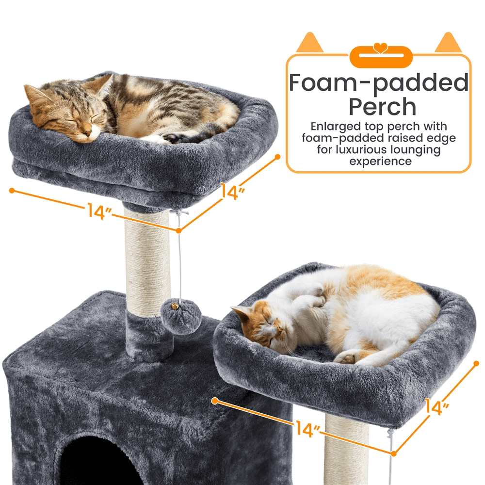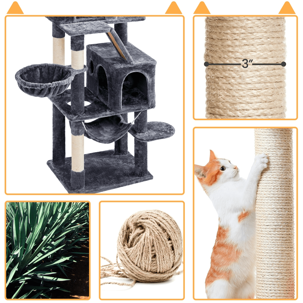 Are you looking for a comfortable cradle for your cats? Why not send this multifunctional cat tree to your cat? All platform and supporting posts are made from solid CARB P2-compliant particleboard and covered with soft plush, which gives your cat extra stability and comfort. The sisal ropes are good things for cats to exercise and sharpen their claws. The top perch with raised edges gives your cat an excellent spot to enjoy the scenes. This large cat house is an ideal choice if you have more than one cat. We have various colors for you to choose from. Do not let your cat wait anymore!