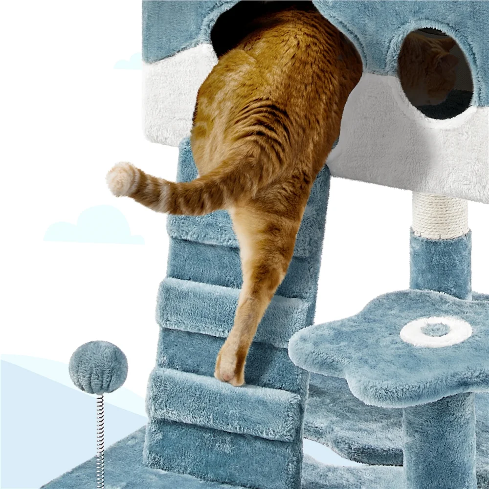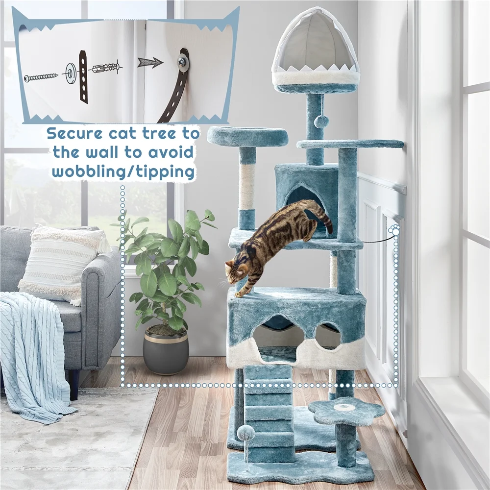 This 72.5″ cat tower is the perfect addition to your home for large cats! It’s packed with style and fun features, including an adorable shark’s mouth-style igloo perch, a fish-shaped scratcher, and wavy-edged boards. Your cats will love the vibrant and exciting oceanic experience this tower provides! This large cat tree is constructed of solid CARB P2-compliant particle boards for a sturdy construction that can withstand even the most playful cats – so you can let your cats have fun to their hearts’ content! And to ensure maximum comfort, we’ve covered it with the softest, plushest fabric you can imagine, making it the ideal spot for your furry friends to relax and unwind. This multi-level cat tower is designed for 3 to 4 medium or large-sized cats to climb and romp to their hearts’ desire. With two perches and two condos, your feline friends will have plenty of cosy spots to snuggle up and observe their surroundings. c