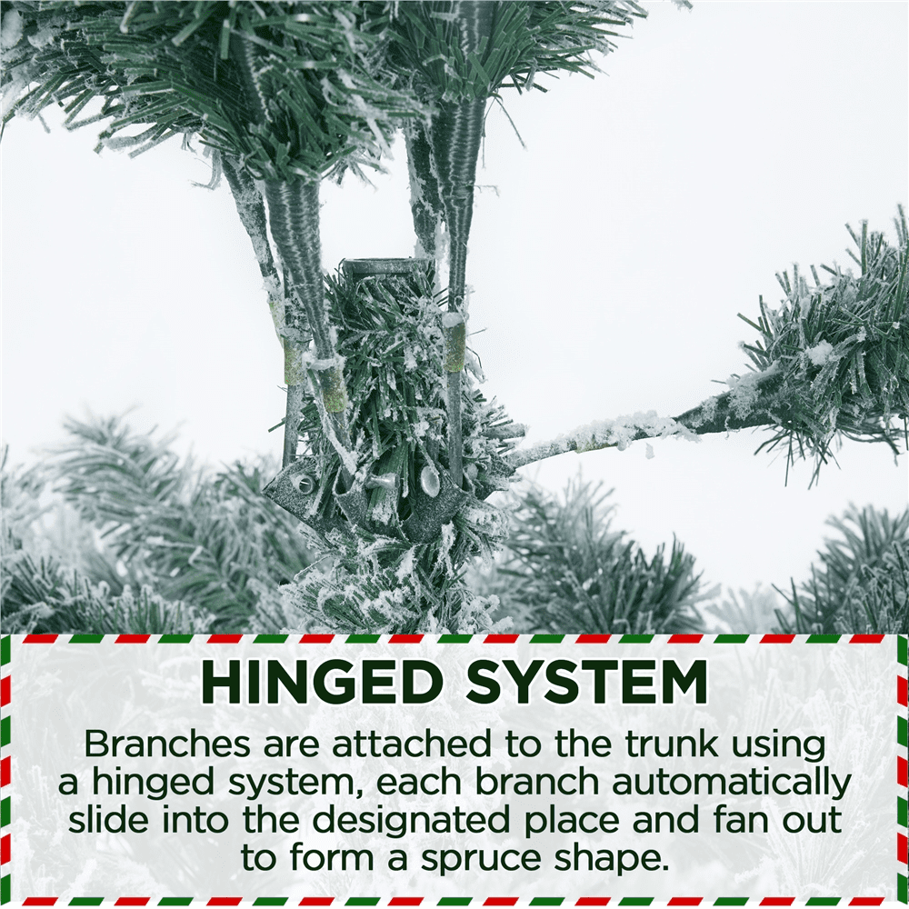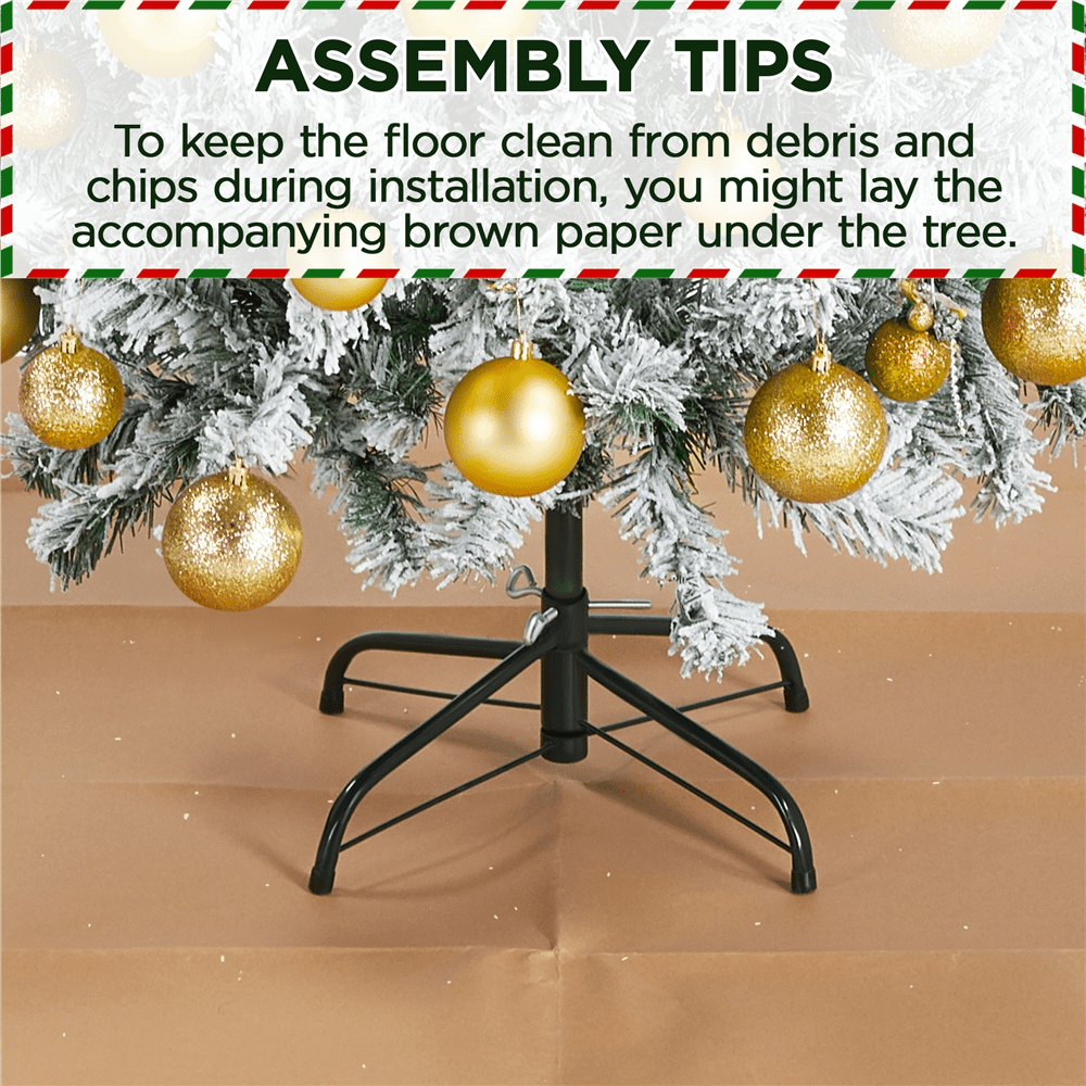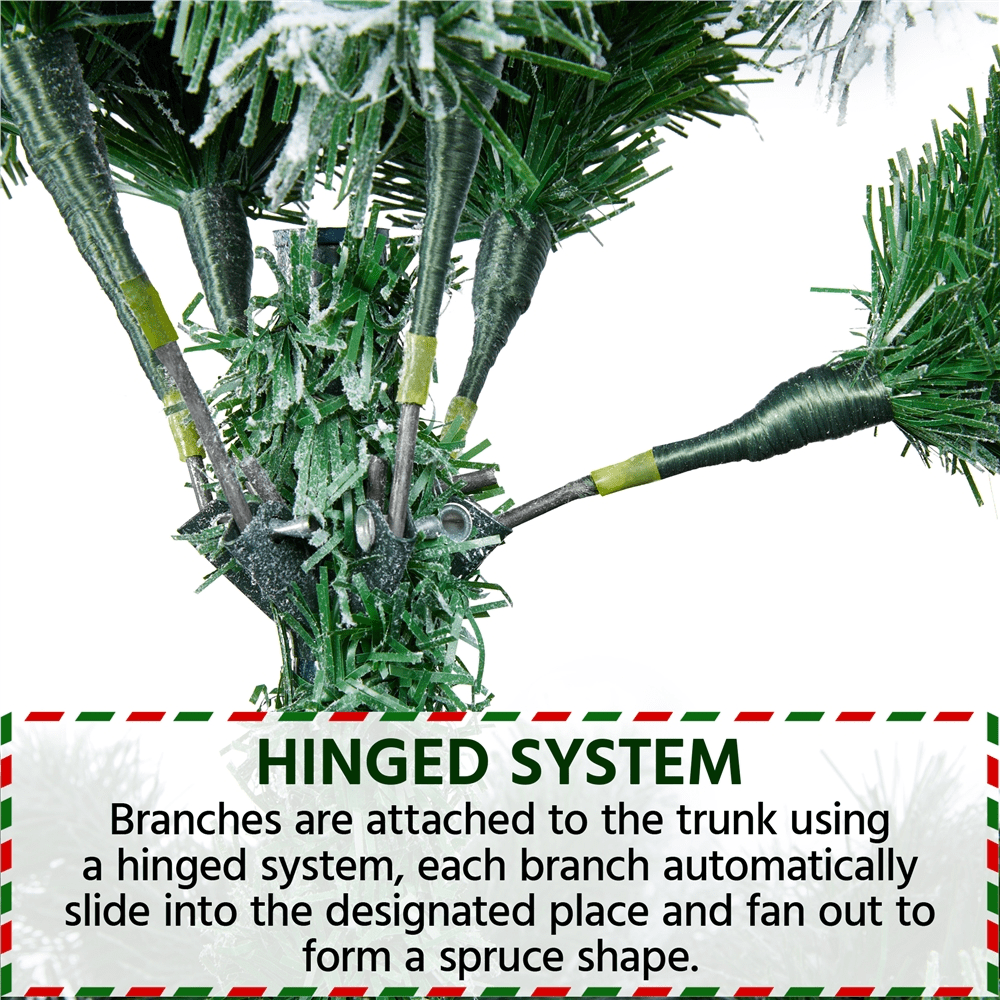 This snow-dusted artificial Christmas tree is made of premium quality materials, including fire-resistant PVC branches and tips covered with white flocking snow, making it classic and traditional. The branches are bendable and can be set in certain directions. A foldable metal stand keeps the tree in place. The tree body is divided into three sections for easy assembly. The branches are bendable and can be set in certain directions. Nicely bent the tips and fluff out the ”leaves”, it is time to enjoy decorating your own Christmas tree with the whole family!
