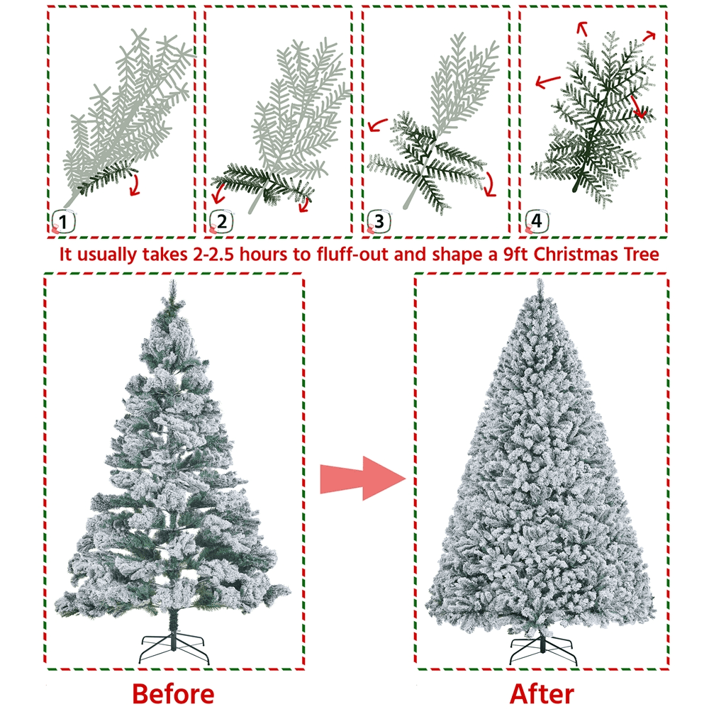 Alden Design 9ft Frosted Artificial Christmas Tree with Foldable Stand,Green: Color: Green Materials: PVC, Iron Type: Unlit Flocked Spruce Total Tips Count: 2108 Assembled Dimensions: 66 × 108” (Dia.× H) Stand Dimension: 28 × 7” (Dia.× H) Tree Trunk Diameter: 1.3” Trunk Pole Thickness: 0.03” Shipping Weight: box #1: 43.4 lb; box #2:19 lb Item Weight: total: 48.5 lb Flexible Tips Foldable Stand Assembly Required Resdential Use