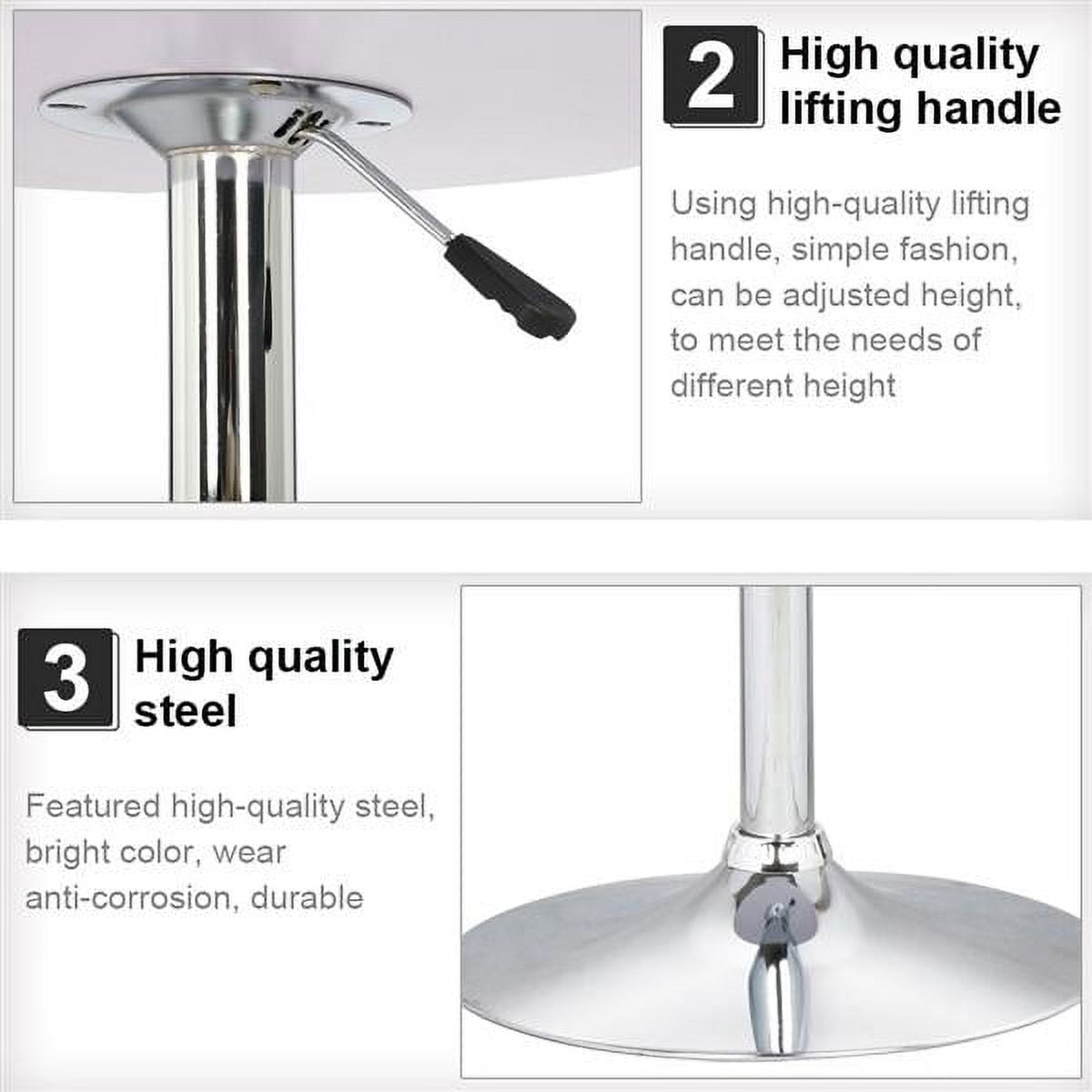 Alden Design Adjustable Chrome Base Round Swivel Bar Table for Bistro Café STURDY & DURABLE TABLE: This heavy-duty table is constructed of 0.7″ thick E1 compliant MDF tabletop and stainless steel stand, the solid structure can hold up to 88 lb, the rust-resistant stand features an anti-skid rubble ring at the bottom to protect the floor, extra safety design for added stability. DECENT SIZE: This table is comfortable for 2 people to sit and accommodates several dishes and drinks; fully utilizes the space and yet not occupies too much of it 360° SWIVEL TABLETOP: Swivel tabletop provides you easy access to the drinks, snack or coffee, perfect for bars, pubs, parties, etc. HEIGHT ADJUSTABLE: Features with a gas lift beneath the tabletop to adjust the table height, transform a kitchen table to a high bar table by an easy operation. VERSATILE: The latest simple design and chic color form a harmonious combination of modern and classic; this stylish bar table can be used indoors or outdoors like a restaurant, bistro, Café, patio, kitchen, dining room, which can perfectly blend with your decor, also adds a sense of elegance to the rooms. EASY TO CLEAN & STORE: Waterproof surface can be wiped clean and will not simply be stained by water, design for easy care and a long use life; Fully detachable parts, this table can be disassembled and packed into a flat and compact size for convenient storage. SIMPLE ASSEMBLY: Simple-structured piece comes with all necessary parts, easy to set up under the detailed instructions. Specifications: G.W.: 20.5 lb Material: E1 MDF and Stainless Steel Overall dimension (Approx.): 23.6 x 23.6 x (27.4-35.8)” (LxWxH) Tabletop (Approx.): 23.6 x 0.7″ (Dia.x Thickness) Adjustable Height (Approx.): 27.4 – 35.8″ Gas Lift (Approx.): 21.3″ – 29.5″ Base Diameter (Approx.): 17.7″ Package Size (Approx.): 25.6 x 25.6 x 6.1″ Color: Black Packing List: 1 x Round Bar Table 1 x Instruction Note: The original color of the MDF desktop is white; it is covered by a layer of the black sticker, not painted. Sir/Madam, you are advised not to put very hot stuff directly on the table in case of the desktop bubble. If you want to put hot stuff on the table, please use it with a table mat together. This product is not built with a locking function.