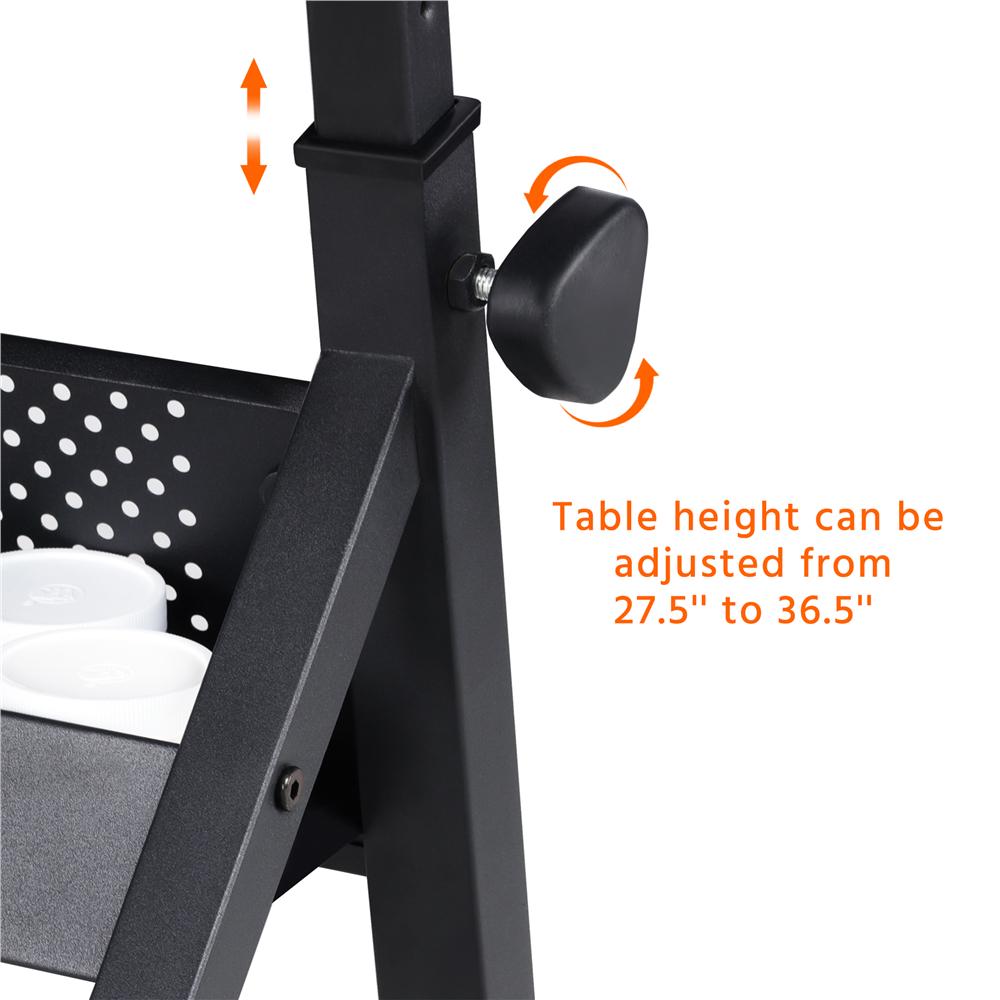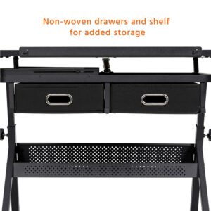 This drawing table has all you need for art and office supply storage. There is a detachable table top that is easy to clean with separate storage slots for stationery. There are two simple and practical non-woven fabric drawers. We have also included an extra metal shelf down below for your drafts or paint cans. The artist table can be tilted at an angle range of 0 to 60 degrees. It can work as a regular flat table for your laptop tasks or a professional drafting table for your art interests. The adjustment system makes it easy for you to control the angle at your will. The drawing board has an adjustable metal pencil ledge attached to the front edge to keep your drawing instruments from sliding or rolling off at a tilted angle. A special adjustment fitting design for you to lock and loosen the pencil ledge with ease. No need to purchase an office chair or stool! We have included one with your purchase.