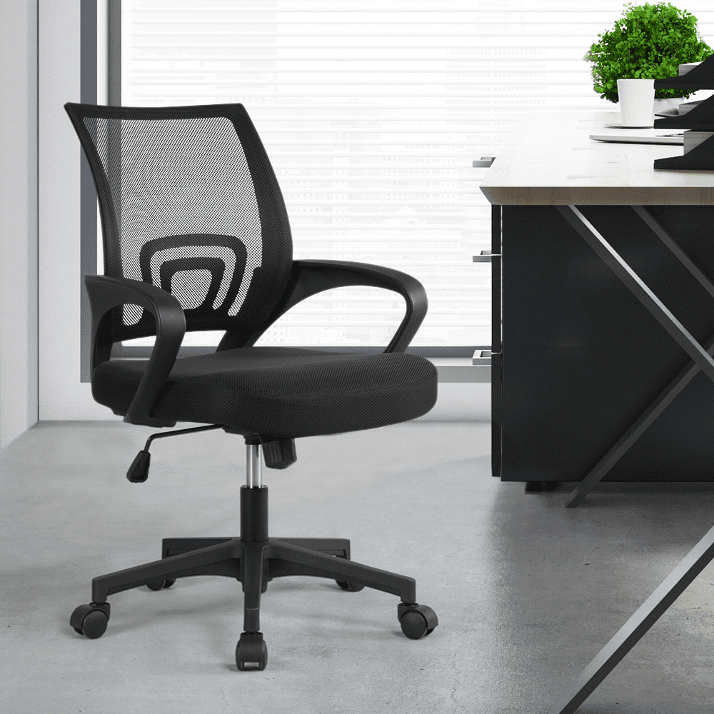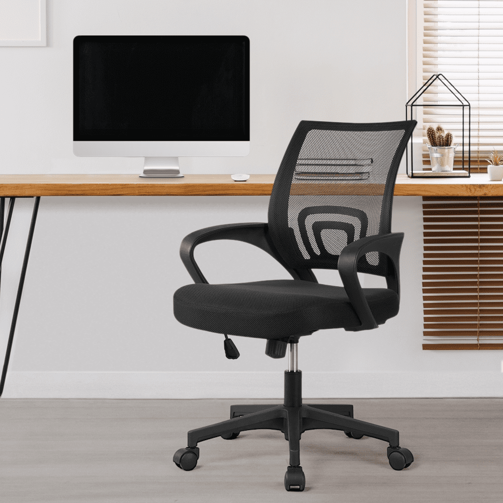 Get extra comfortable in the Alden Design Adjustable Mesh Swivel Office Chair with Armrests. This easy assembly, sturdy office chair is perfect for long work days. In this rendition of our office chair, we have increased the seat size and cushion for optimal comfort. The small lever under the cushioned seat allows you to adjust and customize the chair to your perfect seat height. Featuring a densely knitted mesh backrest, this mesh office chair allows better airflow, accelerating heat and moisture dissipation. The mid-back design supports your spine’s natural curve and protects your lower and middle back as it prompts you to sit straight. The chair material is comprised of steel, iron, PP, nylon, mesh, foam, nonwoven fabric, and composite boards. Our chair comes with a user manual, and please for your safety do not stand on this chair. This is a basic mesh chair, and the backrest is only for supporting your back while sitting. It is not suitable for people to lean back too far, otherwise, the backrest might be cracked.