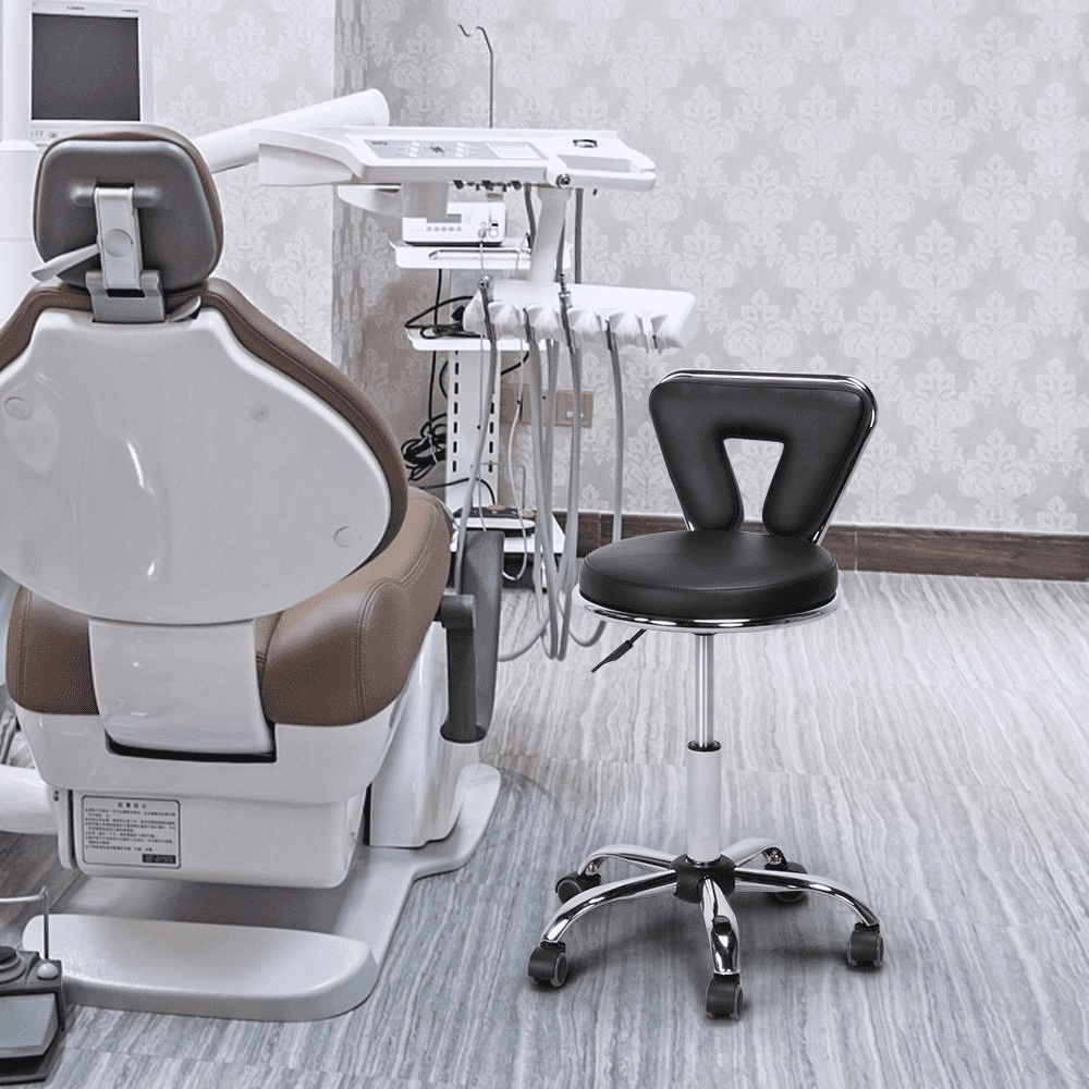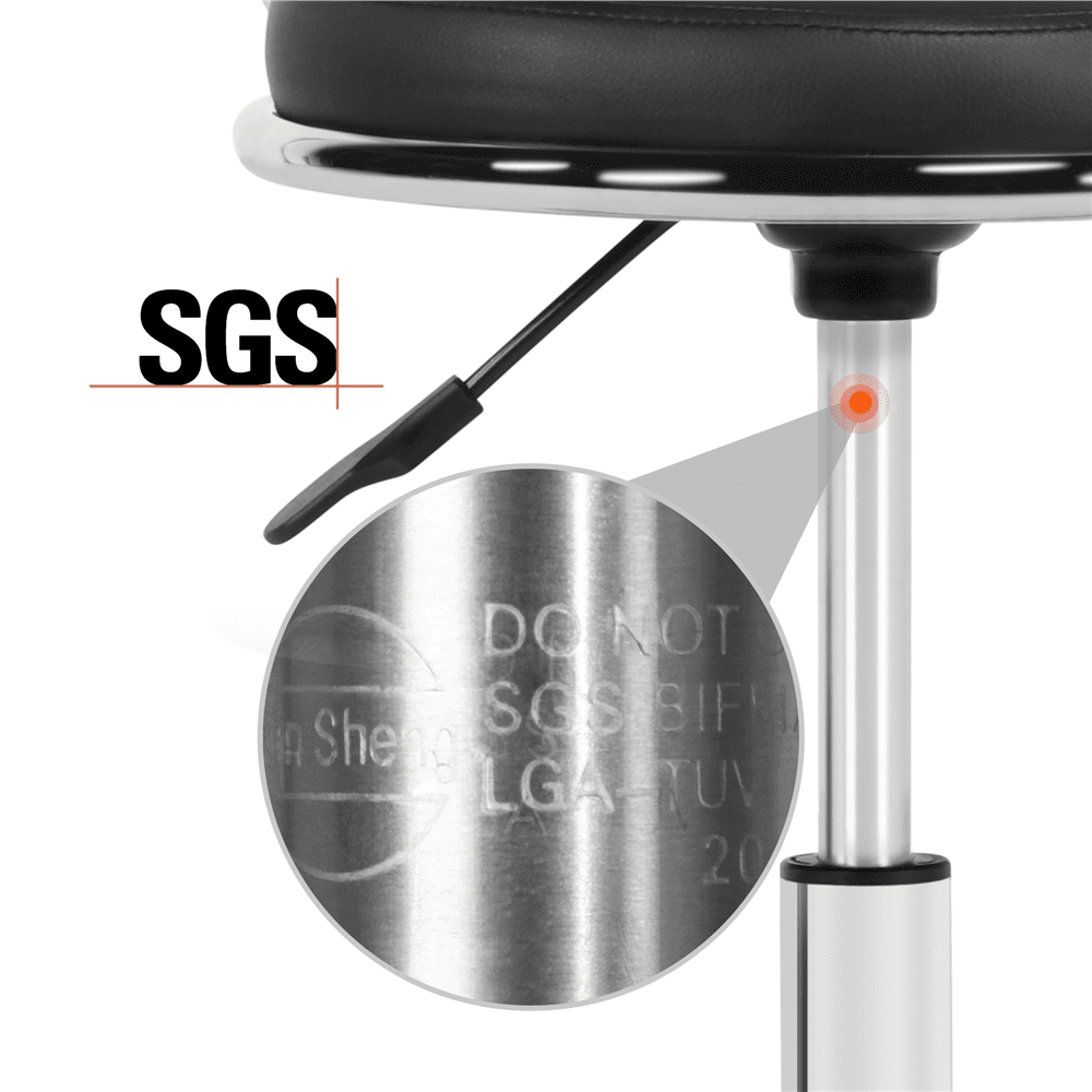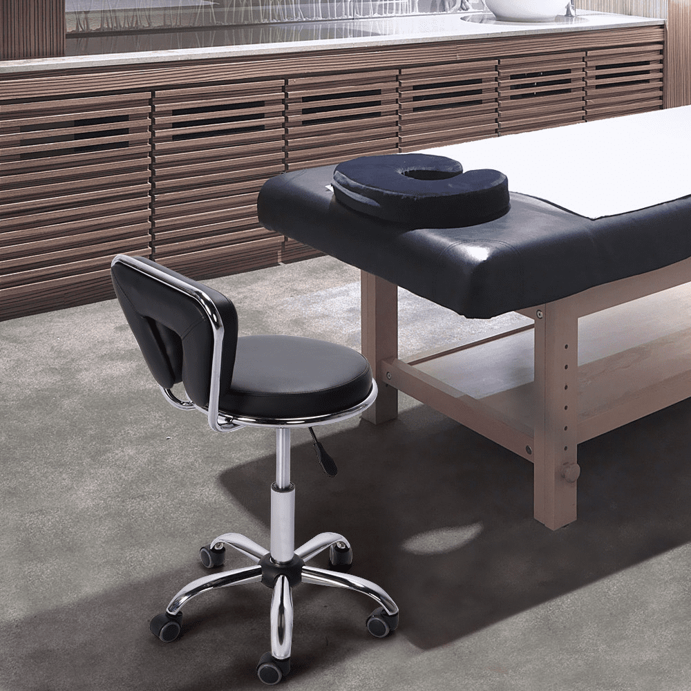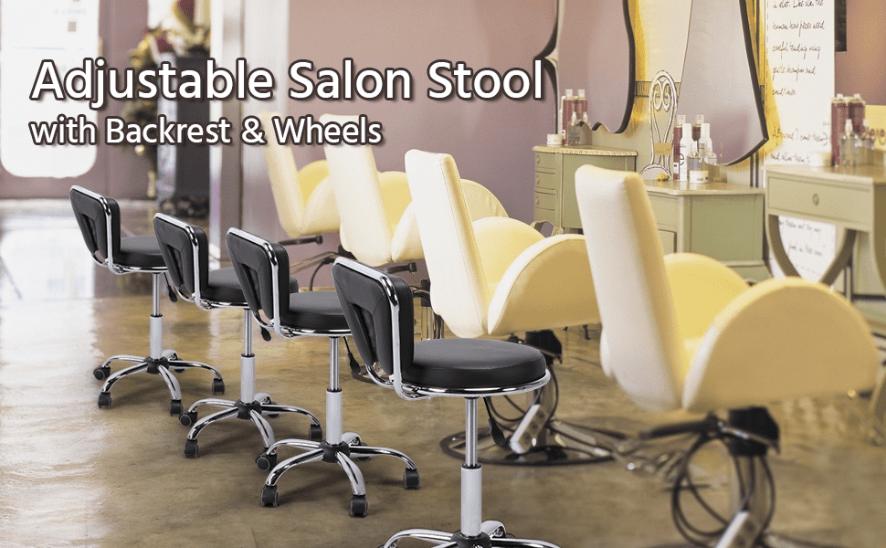 Looking for a stool for your salon or beauty shop? This sleek salon stool with wheels and a backrest can be a good choice. This salon stool is made of chromed metal frame and a thick foam seat enveloped with soft PU leather. This comfortable chair is sturdy enough to hold 120 kg / 265 lb. Five smooth-rolling wheels can be rolled in any direction you want. The seat height can be adjusted from 46.5cm/18.3” to 61 cm/24’’ according to your needs. Founded atop a chromed metal claw base with 360-degree wheels, this salon stool is super easy to maneuver and quiet to roll around your workspace. The rotatable seat is convenient for multi-tasking. Simple assembly is required.