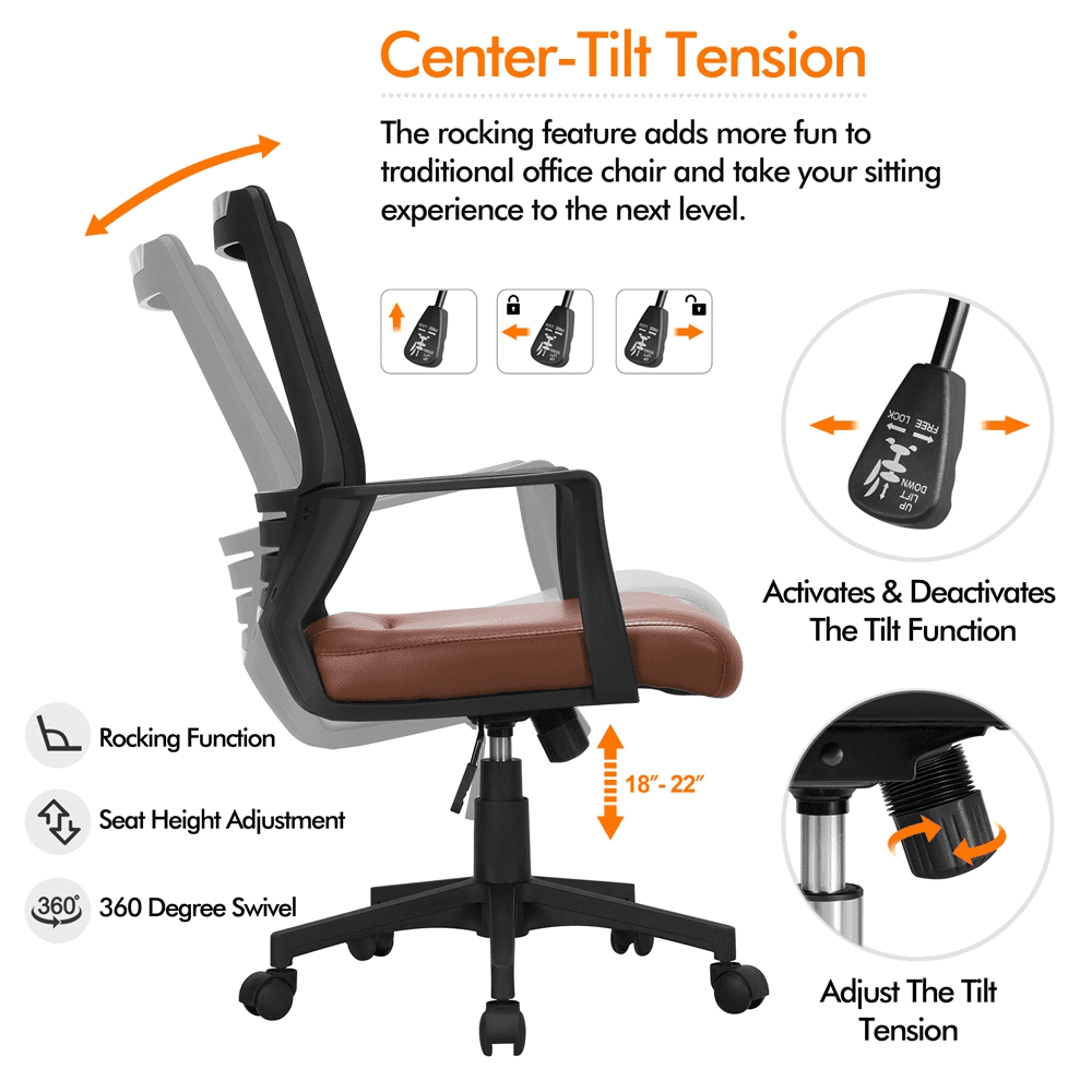 The ergonomic mesh back provides full support to your back and lumbar. The breathable mesh material allows body heat and air pass through the back, avoiding sweat and maintaining a cool body temperature. Rolling on 5 dual-wheel nylon casters will boost productivity. No need to stand up, you can move smoothly from one task to another without scratching the floor. These durable nylon casters can move effortlessly from any angles. They do not produce any noise. The soft seat padding reduces seating muscle fatigue. Back tilt tension is easy to control, you can choose to tighten or release the tilt-tension by turning the knob beneath the seat while rocking back and forth. Seat height can be adjusted from 18-22 inches high. This desk chair is great for both adults and children. The sleek style will blend with any space: home study, activity room, executive room, office, meeting room, etc.