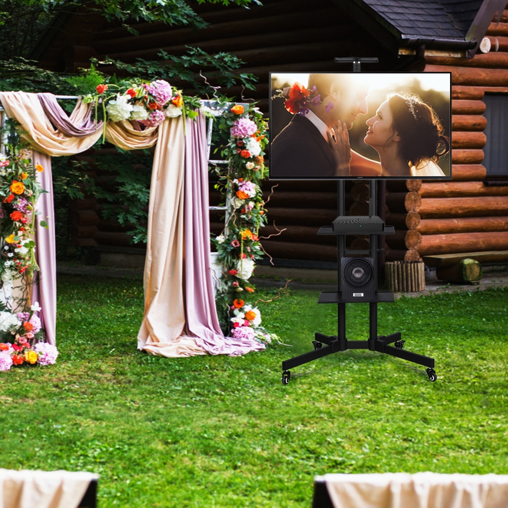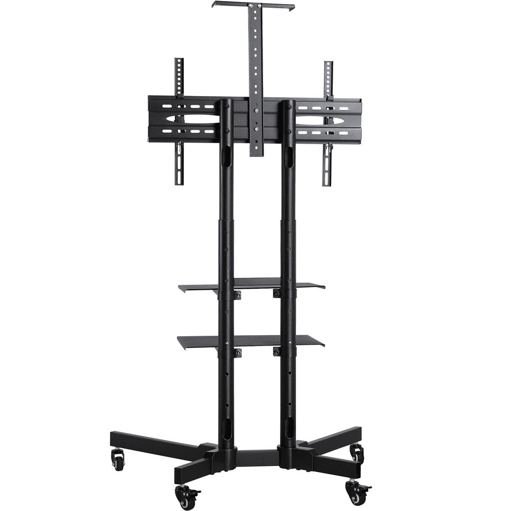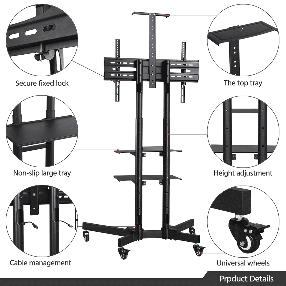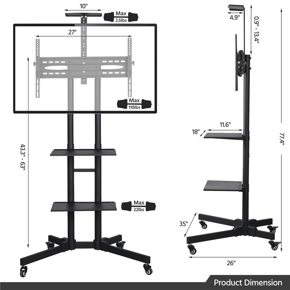Alden Design Adjustable Rolling TV Stand with Lockable Wheels and 2 Shelves for 32in to 75in TVs, Black: Material: Powder coated steel, plastic Suitable TV size: 32″-75″ Overall dimension: 35 x 26 x 77.4″ (L x W x H) VESA standard: from 100(w)mm x 100(h)mm to 600(w)mm x 400(h)mm Height adjustment of hanging board: 43.3 – 63″ Top shelf size: 10 x 4.9 x 0.8″ (L x W x H) Lower shelf size: 17.9 x 11.6″ G. W.: 35.9lb