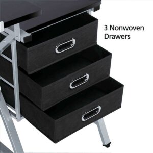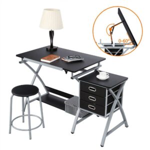 This drawing table has all you need for art and office supply storage. There is an adjustable table top that is easy to clean with separate storage slots for stationery. There are two simple and practical fabric storage drawers. We have also included an extra metal shelf down below for your drafts or paint cans. The artist table can work as a regular flat table for your laptop tasks or a professional drafting table for your art interests. The adjustment system makes it easy for you to control the angle at your will. The drawing board has an adjustable metal pencil ledge attached to the front edge to keep your drawing instruments from sliding or rolling off at a tilted angle. A special adjustment fitting design for you to lock and loosen the pencil ledge with ease. No need to purchase an office chair or stool! We have included one with your purchase.