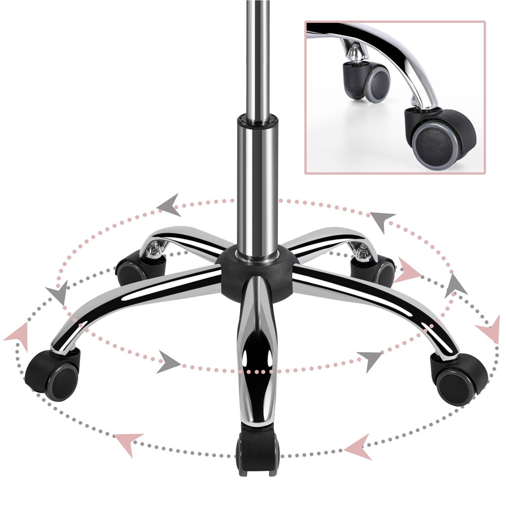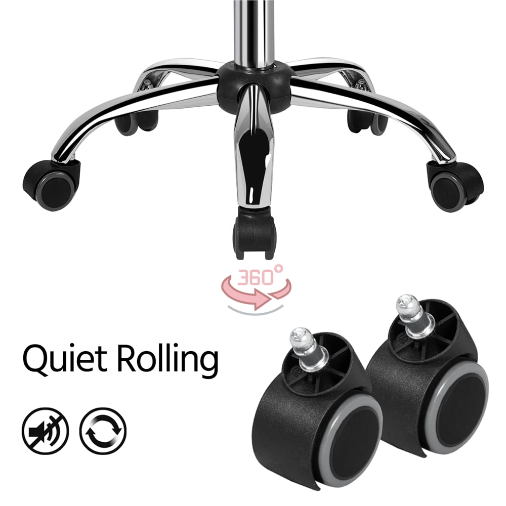 The thick foam padded seat and back of the stools are covered with premium PU leather, super soft, and comfortable to sit on for a long time. Sturdy legs are made of plating steel, which ensures both good rust resistance and a shining appearance. Adjustable seat height makes the stool more flexible to meet your various needs. 360° swivel seat for an optimal angle without moving the stool and 5 heavy-duty casters for easy mobility.