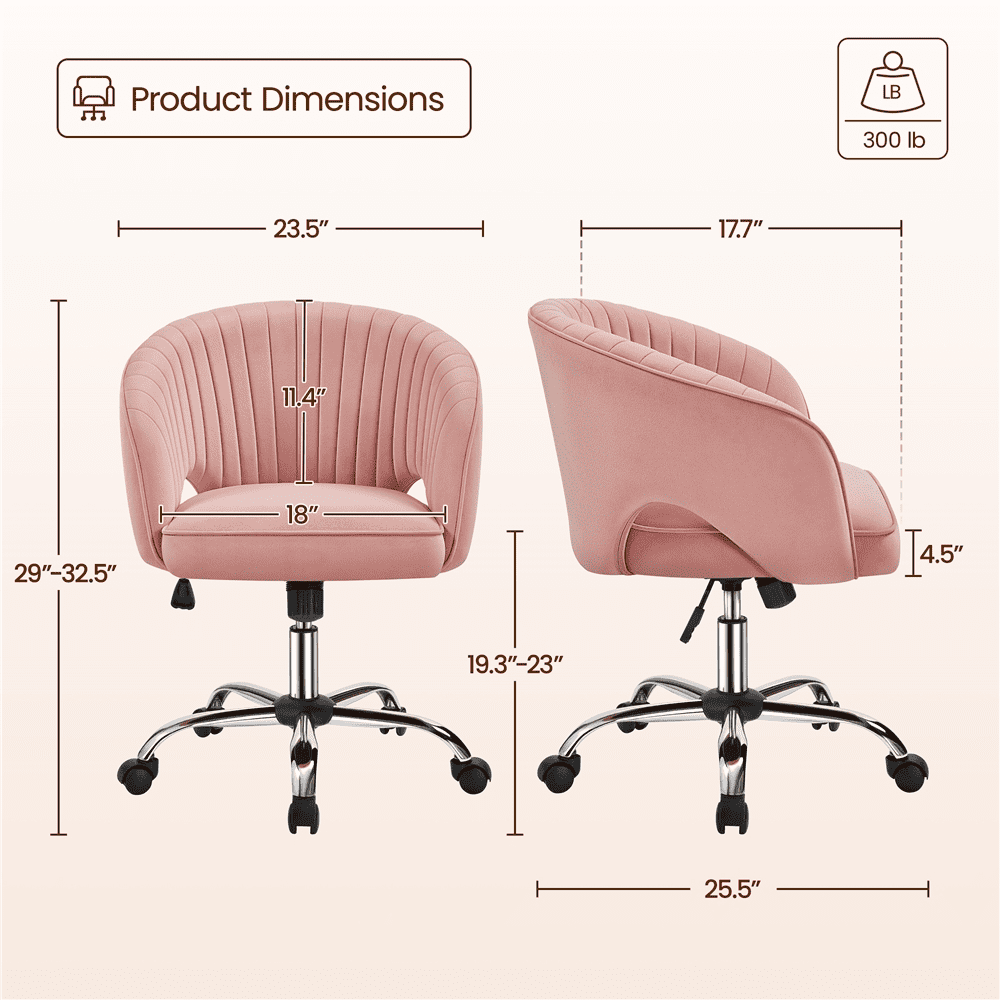 Alden Design Adjustable Tufted Velvet Office Chair with Barrel Back for Home Office, Pink Color: Pink Materials: Polyester, foam, plywood, metal, PP Overall Dimensions: 24” L × 22.5” W x (29-33)” H Seat Size: 16” W × 18” D Adjustable Seat Height: 18.3-22.2″ Maximum Weight Capacity: 300lb Net Weight: 19lb Shipping Weight: 22.7lb Note: Please allow a 0.6’’ measurement tolerance. Comfy Mid Back Desk Chair 360-degree Swivel Residential Use Assembly Required