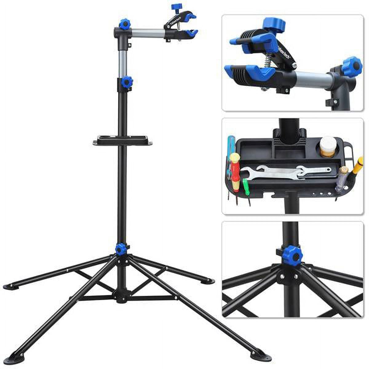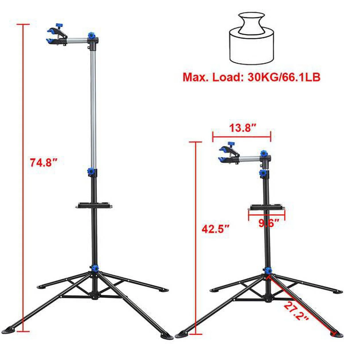 Alden Design Bicycle Bike Repair Stand Cycle Rack Adjustable 52 inch to 75 inch Portable Tool Tray Features: High-quality materials: Our Bicycle Repair Stand is made of sturdy and high-quality iron and PA. It is sturdy and stable. It can carry up to 66 pounds (30 kg), which is enough to support your bicycle; 360° swivel clip: 360-degree swivel clip of the Bike Repair Stand allows your bike to be held in any position, two pivots and height adjustments provide maximum flexibility. It has rubber material, so it will protect your bicycle’s paint very well. Easy to install: This Bicycle Maintenance Rack is easy to assemble, including all instructions and hardware. It is widely used, telescopic, folding, lightweight, easy to carry and transport, and small-space storage; Free tool tray: Equipped with brackets to keep your tools organized and suitable for various repairs or assemblies; Rugged frame: The heavy-duty structure and 4-legged base of the Bike Stand securely support and grab the bike, making it easier to repair and clean your bike. Telescopic rod: The telescopic rod keeps the handlebar and front wheel stable, reducing frustration;