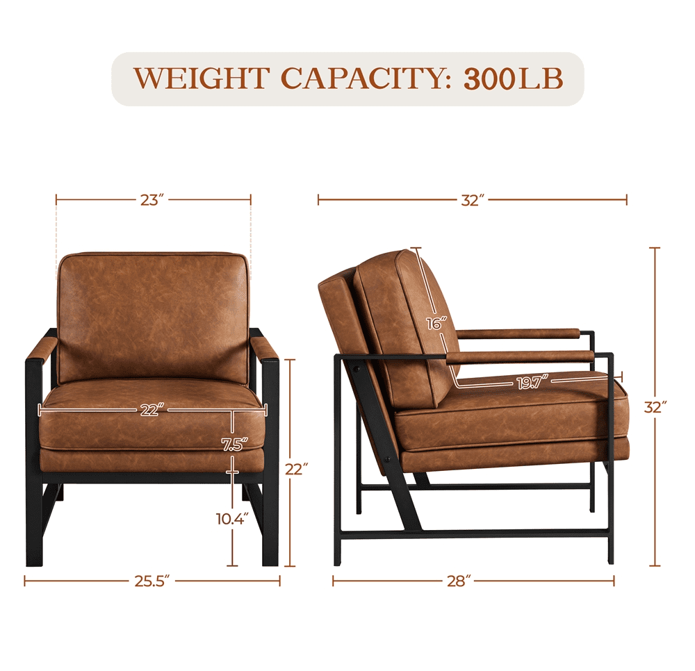 Alden Design Faux Leather Modern Accent Chair with Metal Frame, Light Brown Materials: Iron, PU leather, foam, composite board, solid wood Overall Dimensions: 25.5×31.5×32″ (WxDxH) Seat Size: 22×18.7″ (WxD) Seat Height: 17.7″ Maximum Weight Capacity: 300 lb N.W.: 33.4 lb G.W.: 39.9 lb Color: Light Brown Note: 1. For your safety, please do not stand on the chair. 2. Please allow a 0.6″ measurement tolerance. Sturdy and Durable Faux Leather-padded Armrest & Loose Back Pillow