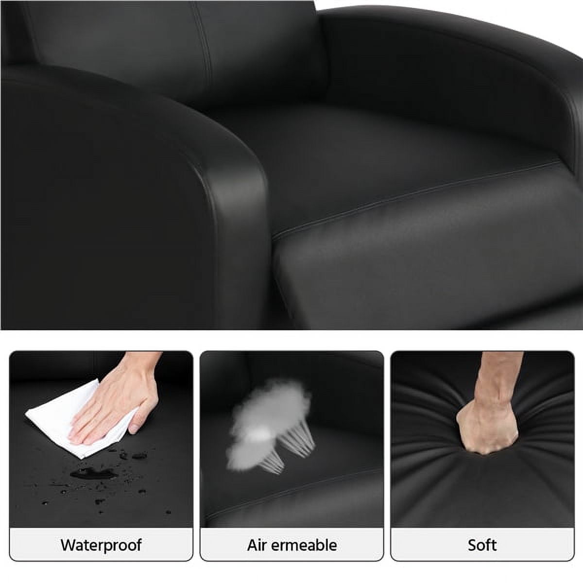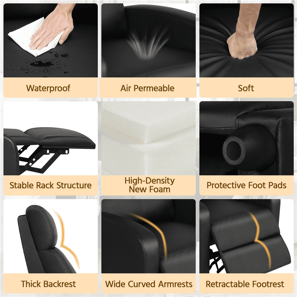 This recliner is built of high quality materials that are water-resistant and easy to clean. The faux leather reclining chair features a soft-cushioned seat, and an extra thick foam filled backrest and footrest. The upholstered faux leather is soft to the touch and has an elastic and flexible feel. This chair sits on four sturdy feet equipped with non-marking pads, which protects both the sofa and the floor while moving. The thick high density foam is supported by quality pocket spring that provides support while sitting. By pushing at the backrest, the footrest instantly pops up so you can recline at a variety of different angles. This recliner is the perfect piece for any living room, bedroom, home office, or den. The contemporary and transitional style blends in with any home decor.