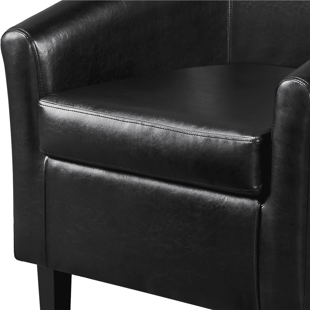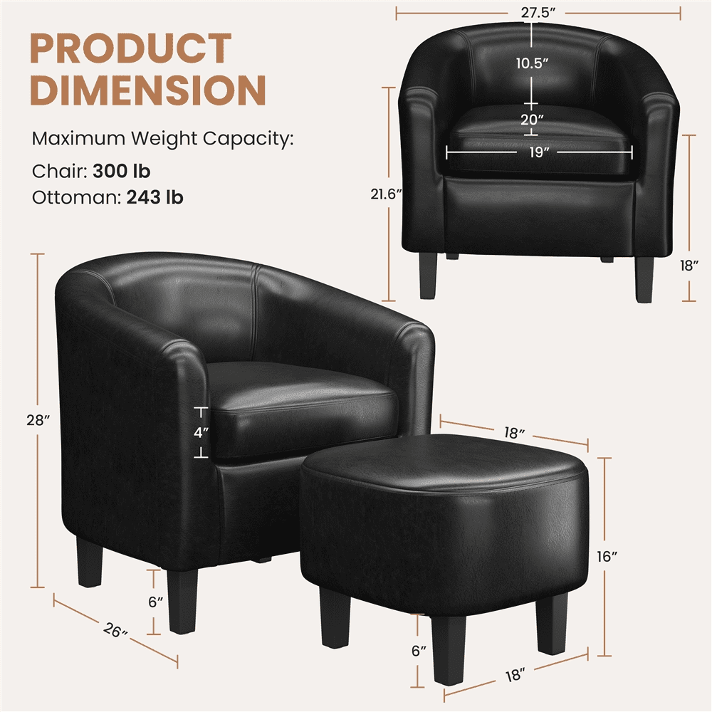 Features: Extra Comfortable: Our barrel chair with ottoman is built for utmost comfort. 48 cm/18.9 inches (width) x 50 cm/19.7 inches (depth) seat and 32.5 cm/12.8 inches height backrest give you a larger sitting area and stronger support. Designed for ultimate comfort, the ottoman stuffed with thick foam is a good place to rest your feet and relax Luxurious and Sleek: The club chair and ottoman perfectly combine straight and curved silhouettes and finished faux leather upholstery for a luxurious touch, bringing a sleek and chic look to your room. The barrel shape of the chair well matched with the semicircle ottoman, this eye-catching set will stand out in any room Recliner and Footrest: Feel tired when sitting upright for a long time? Our club chair with footstool could solve your problem. The high backrest and thick cushioned seat, accompanied by supportive armrest and medium-size footstool, which is perfect for lounging on lazily. You can do reading, playing computer games, or napping on the adorable chair Superior construction: This set of club chair and ottoman is crafted with the plywood frame, pine wood legs, and upholstered with foam-filled seat. Covered in quality faux leather, this durable and sturdy chair can support 136 kg/299.8 lb, and the ottoman is capable of holding 110 kg/242.5 lb Easy assembly: We provide all the necessary hardware and tool, and an illustrated installation manual to help you set up this barrel chair and ottoman set. Make cleaning a breeze: Our barrel chair set is fully covered in quality PVC leather. Its good water-resistance leaves you no worries about the spilled drink. The 10cm/4″ thick seat cushion is removable for easy cleaning. Once soiled, just spot clean it with a damp cloth Painstaking details: Our club chair set is carefully crafted in many details. The curved armrest is perfectly lining up with your arms. Four protective pads on the feet of the accent chair set can keep your floor away from scratches. Specifications: Overall Chair Dimension (WxDxH): 70 x 64.5 x 71.5 cm/27.6 x 25.5 x 28” Overall Ottoman Dimension (WxDxH): 47.5 x 46 x 40 cm/18.7 x 18 x 15.7” Seat Size (WxD): 48 x 50 cm/18.9 x 19.7” Seat Height: 46 cm/18” Maximum weight capacity: Chair – 136 kg/299.8 lb; Ottoman – 110 kg/242.5 lb G.W.(Club Chair and Ottoman): 17 kg / 37.5 lb Color: Black
