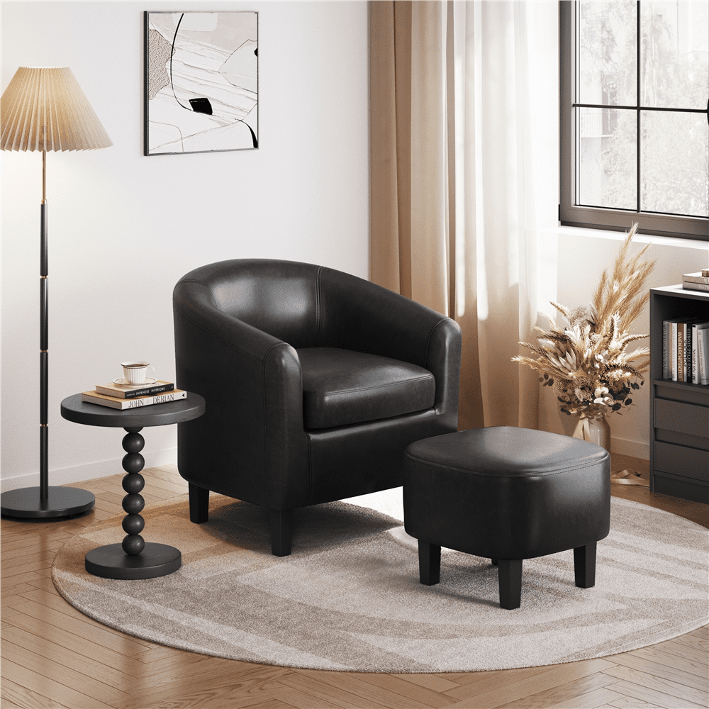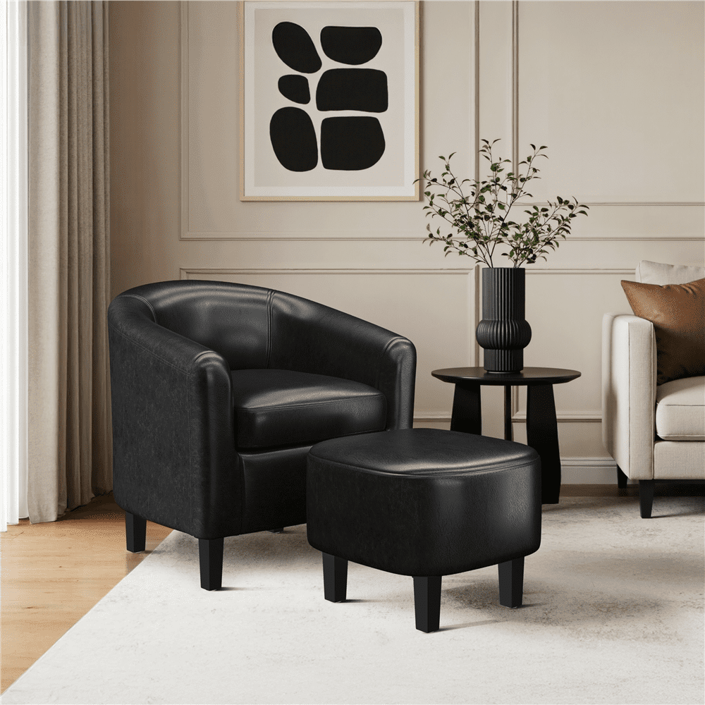 Alden Design Faux Leather Club Chair with Ottoman for Livingroom, Black