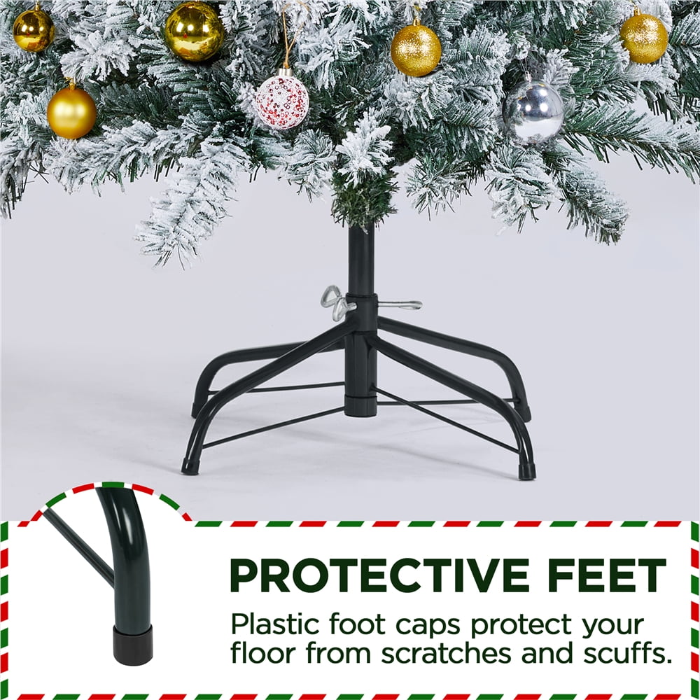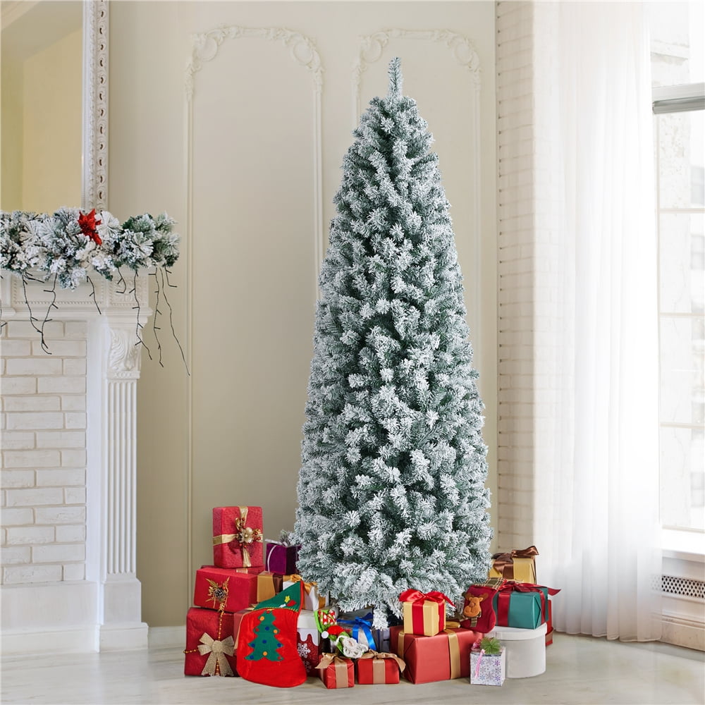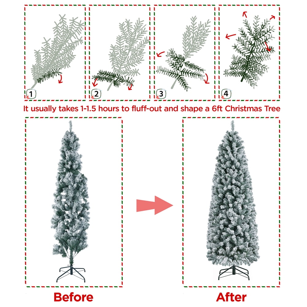 Alden Design Our flocked pencil Christmas tree can not wait to celebrate a magical holiday with your family! We have an ultra-realistic appearance that thanks to the lush and fluffy branched and tips. These needles are made of quality PVC that is durable, bendable and fire-resistant. The snow-dusted design makes it even more festive and traditional. Best of all, the leaves do not fall on the floor, no maintenance is required. The pencil shape is slim and does not take too much of your living space. Wide and metal base is anti-collapse and stable to hold enough lights and decorations on the tree. Please enjoy a sweet and fun time setting up this stunning Christmas tree with your magical ideas and wish you a Happy Christmas!