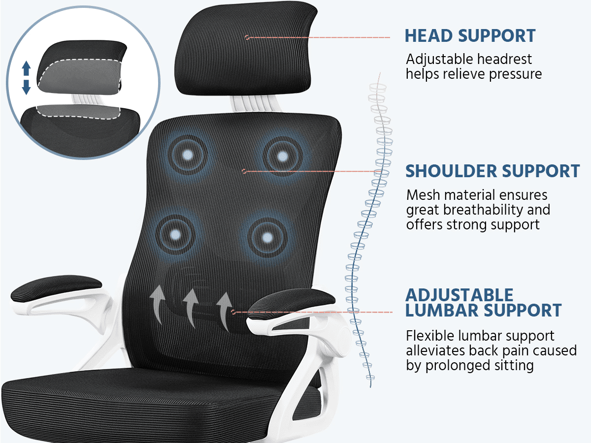 If you spend a lot of time in front of your desk, you’ll need such a comfortable and functional office chair. High mesh back supports your entire back, neck and head, at the same time, bringing a cool using experience. A large, cushioned seat relieves fatigue from a long time sitting. Best of all, our desk chair is highly adaptable to your preferences. The seat, lumbar support and headrest can all be adjusted within a certain height range for maximum comfort. Armrests with foam padding are ideal for resting your arms and can be flipped up for space saving. The star base with five nylon castors allows 360° smooth and mute mobility. To add more fun, users can adjust the tilted angle of the backrest to enjoy rocking back and forth. Start a productive but relaxing day from now on!
