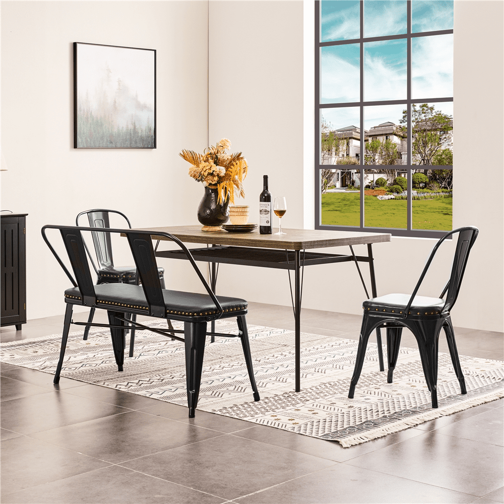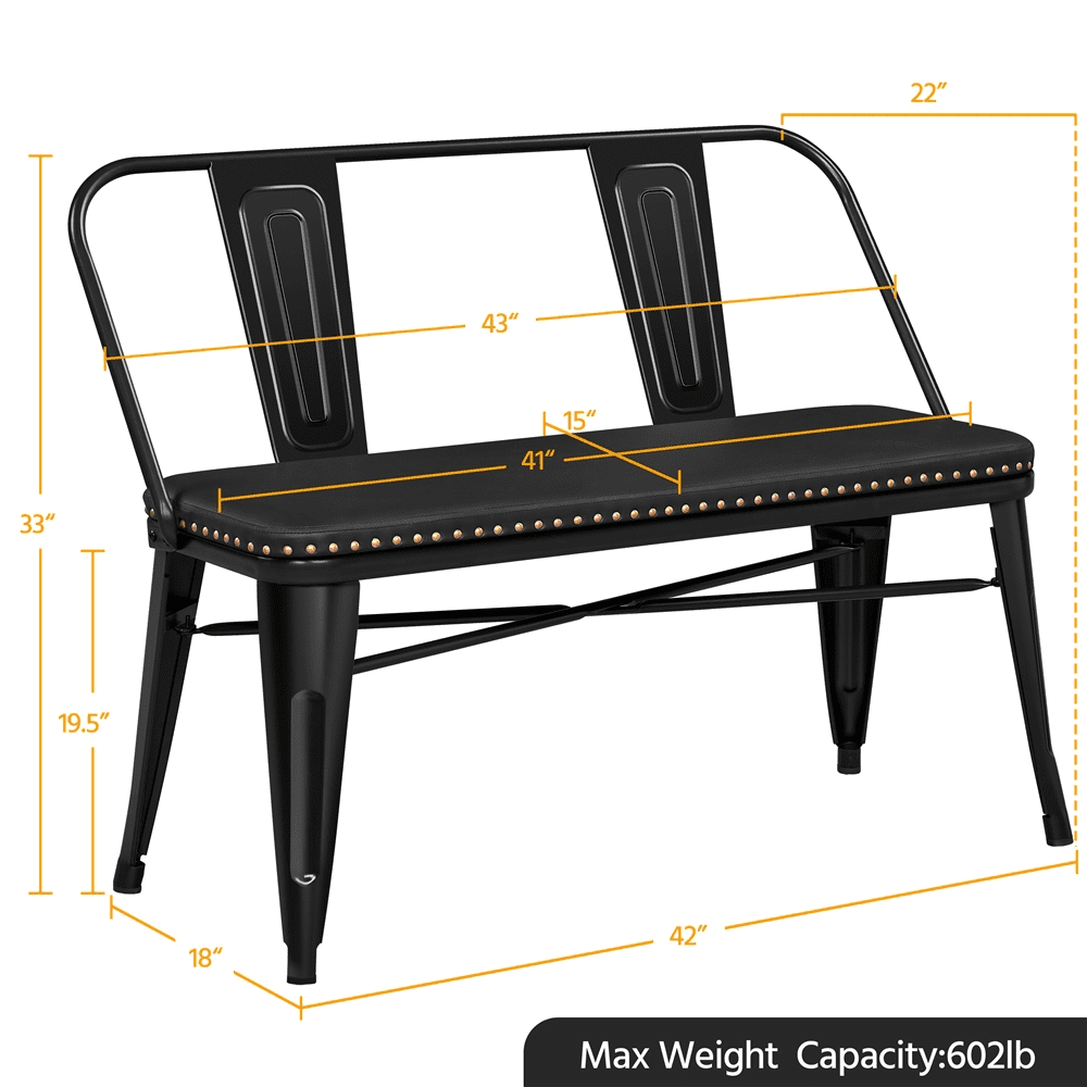 SmileMart Industrial Metal Dining Bench with Removable Backrest, Black Color: Black Materials: PVC Leather, Iron, Foam, Non-woven Fabric Overall Dimensions (without backrest): 42″ L × 18″ W × 19.5″ H Overall Dimensions (with backrest): 43″ L × 22″ W × 33″ H Seat: 41″ L ×15″ W × 19.5″ H Maximum Weight Capacity: 602 lb Net Weight (assembled product weight): (with backrest) 27.3 lb; (without backrest) 21.4 lb Gross Weight (product in the bo×): 31.5 lb Note: 1. Please allow a 1/2″ measurement tolerance. 2. For safety, please do not stand on the dining bench! Metal Bench with Upholstered Seat Comfortable Sitting Experience