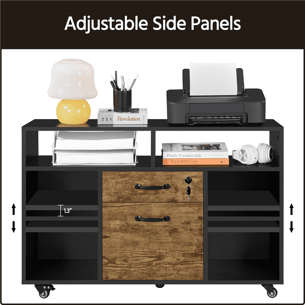 Get tired of rummaging through the office with overwhelming files and office supplies to get a file? Let this large office storage cabinet save you. Featured by a spacious top, separated open and closed storage areas, 5 flexible industrial-grade casters, and a chic and sleek outlook, this office printer stand is no longer a traditional boring filing cabinet. It can pair with any wood or industrial-style space as a storage unit or a display cabinet.