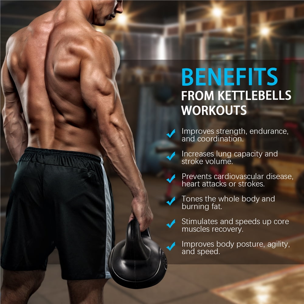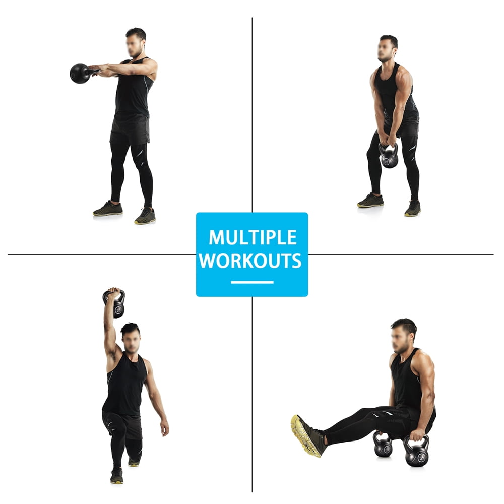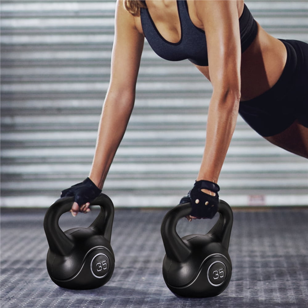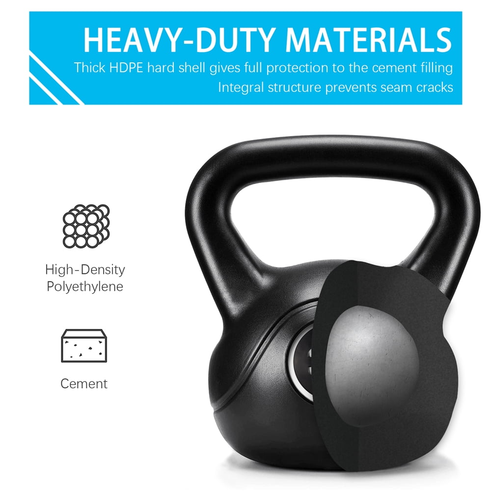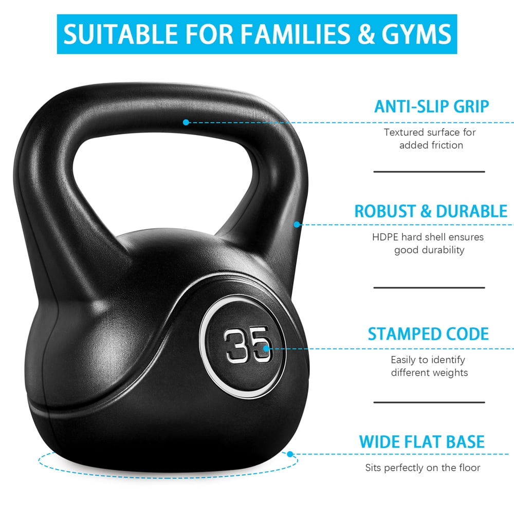 The kettle bells are made of durable HDPE hard shell and cement filling, this 35lbs kettlebell is a cost-effective alternative to the traditional cast iron kettlebells. The HDPE coating protects your floors especially when dropped accidentally. The wide grip allows you to comfortably hold the weight with one or two hands, and swing it conveniently and safely.