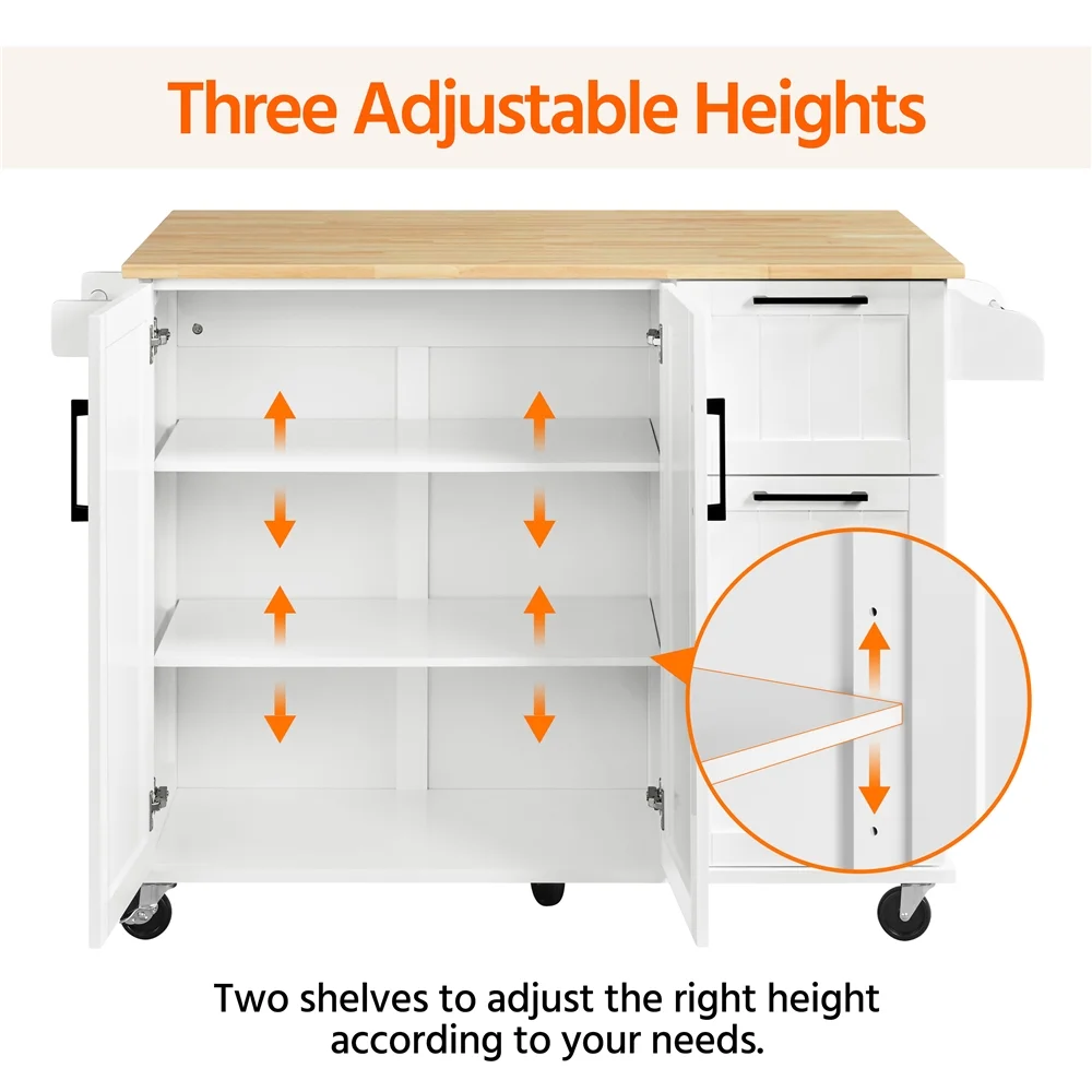Alden Design Kitchen Cart with Wood Top and Storage Cabinet, White Color: crisp white cart, wood color countertop Material: MDF, rubberwood, particle board Overall dimension: 134.5cm L x 46cm W x 91.5cm H/53” L x 18” W x 36” H Countertop size: unfold the drop-leaf board: 113cm L x 75.6cm W/44.5” L x 30” W; fold the drop-leaf board: 113cm L x 45.6cm W/44.5” L x 18” W Drawer inner size (ea.): 34cm L x 29.4cm W x 15cm D/13.4” L x 11.6” W x 6” D Spice rack inner size: 32.5cm L x 13.4cm W x 11cm H/12.8” L x 5.3” W x 4.3” H Cabinet shelf size (ea.): 68.5cm L x 38.2cm W/ 27” L x 15” W Adjustable shelf height (from the cabinet shelf to bottom shelf): the first shelf: 59.2cm/23.3”, 53cm/21”, 46.4cm/18.3”; the second shelf: 33.2cm/13”; 27cm/10.6”; 20.4cm/8” Max. load capacity: tabletop (with the drop-leaf board): 80kg/176lb; drop-leaf board: 10kg/22lb; cabinet shelf (ea.): 18kg/40lb; drawer (ea.): 6kg/13lb G.W.: package 1: 36kg/79.4lb; package 2: 19kg/42lb N.W.: total: 50kg/110lb Note: 1. Please allow ±1cm/0.5” errors due to manual measurements. 2. Please do not sit/stand on the countertop for your safety. Assembly Required Residential Use