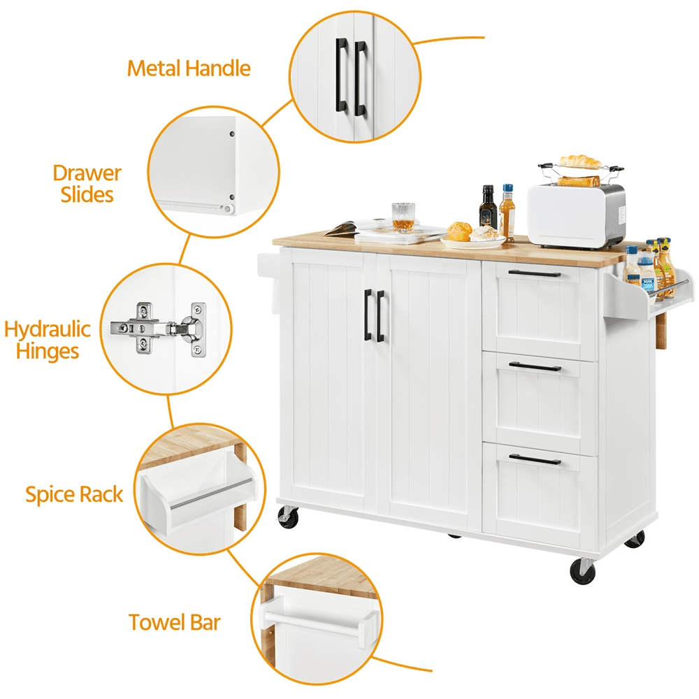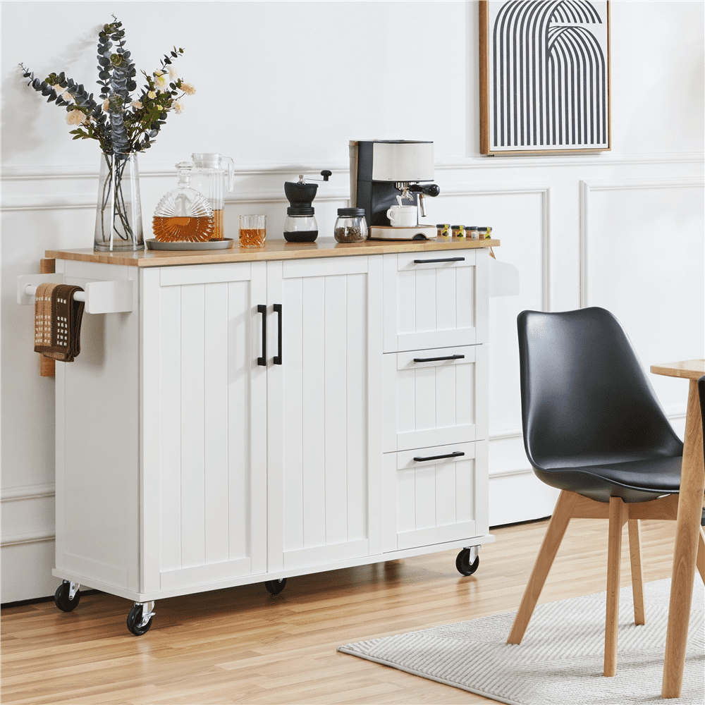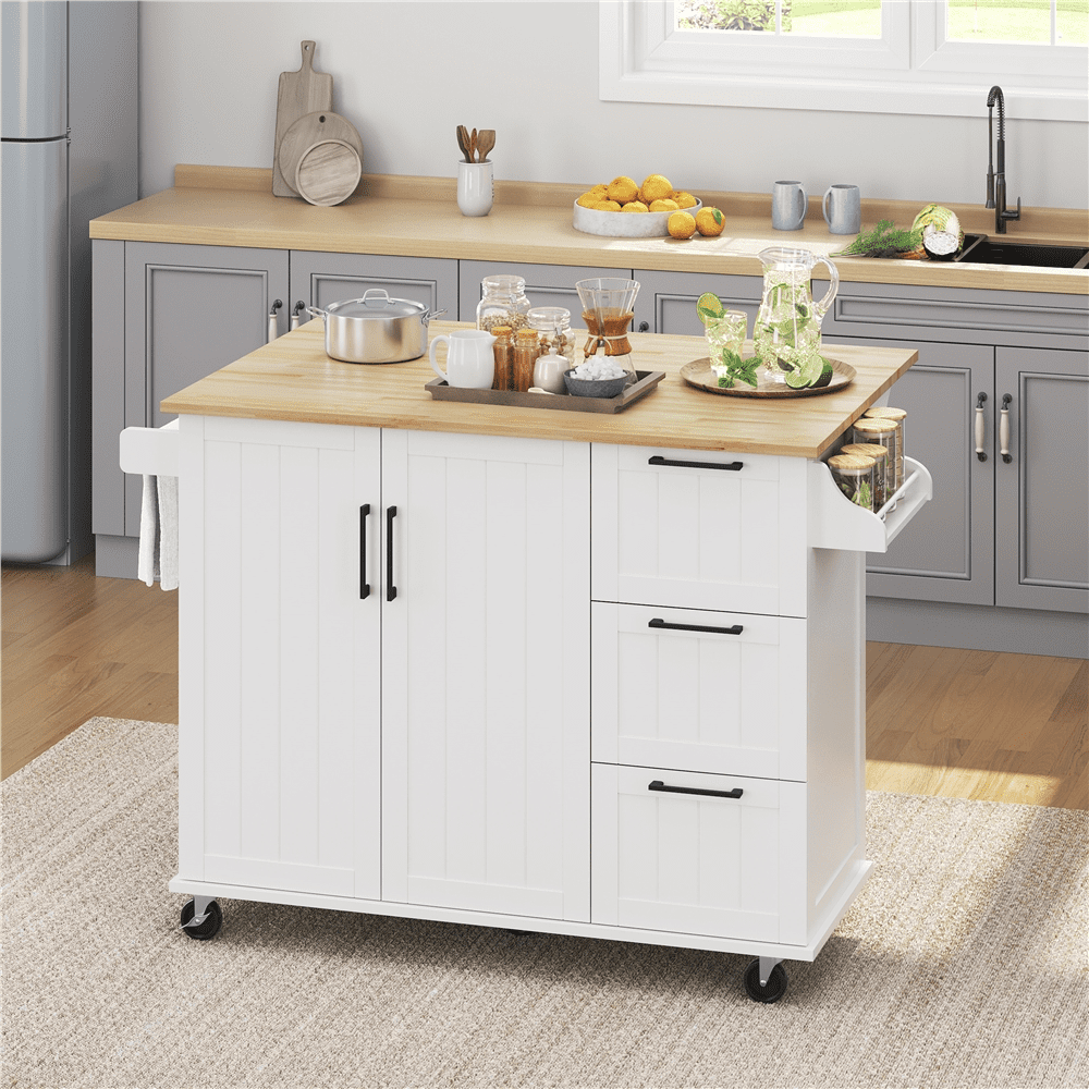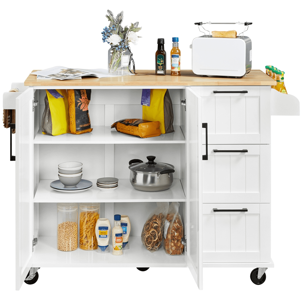 Narrow kitchens with limited counter space are usually a headache issue when living in a small space, but utility storage solutions like rolling kitchen trolleys and kitchen island carts can help you store and organize your kitchen essentials, make your kitchen clean and tidy.The cart is mainly made of CARB P2-compliant MDF with powder coating and water-resistant rubberwood, sturdy and durable. It features three utility drawers, a spice rack, a towel bar and a large cabinet with 2 inner adjustable shelves to store your kitchen essentials. Best of all, the drop-leaf design could undoubtedly give additional space to you when needed and fold down to save space when job is done. Its elegant design and neutral coloring make this mobile kitchen island a welcome addition to both classic and contemporary kitchens.
