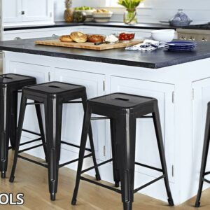 This metal stool set stands out for its excellent durability, which can be used indoors, outdoors, or for home commercial purposes. The stool has been made with remarkable quality, a welded reinforced crossbar and footrest guarantee proper sturdiness. The stackable, space saving stools will only occupy a corner of the room if you have them stacked up. This is an ideal purchase for limited or crowded spaces. This chic and practical addition to your home has a matte surface painted with a unique metallic color. The metal stools will introduce an industrial, chic feeling to your room. The 24 inch high stools are a perfect choice for kitchen counters, bar counters, outdoor parties, cafés, restaurants, bars, etc. There are no sharp, rough, or uneven surfaces or edges. Built-in protective feet and tabs help keep both your hard floors and stools free from damage. They are easy to lift featuring a hole in the top for grasping.