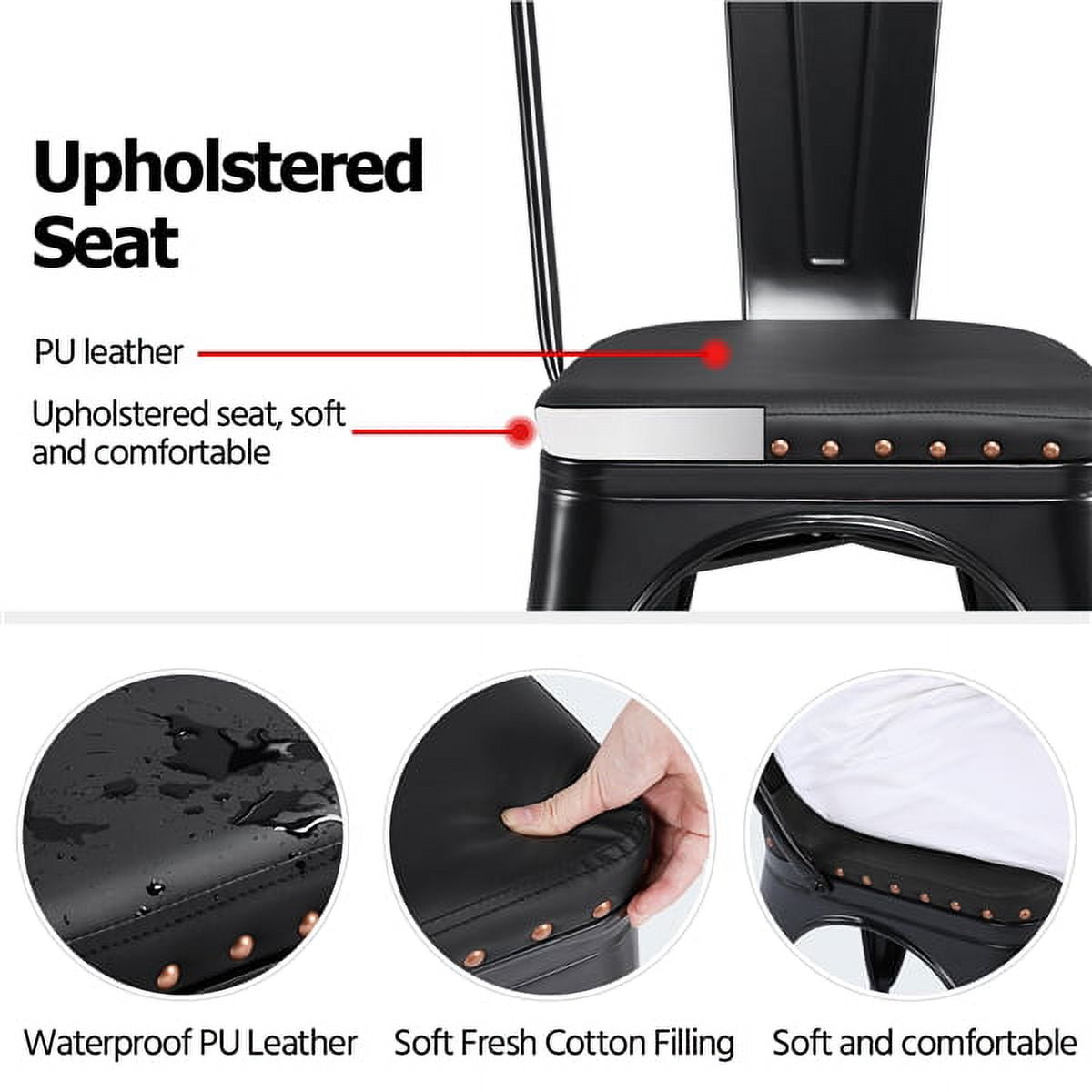 *Features: Soft cushion & reliable backrest: To improve comfort, we adopt upholstered seat and ergonomic backrest so that you feel comfortable and relaxed when you sit on the chair. After a long day, sit down and enjoy delicious foods with your beloved. Fashion punk style: Our dining chairs feature fashion punk style and full black color with matt finish. The metal frame matches leather upholstered seat with riveted sides. These fashion dining chairs are durable, fully-sealed, and fabulous. Set of 4 chairs: As a perfect set of kitchen furniture, our dining chairs are sold in 4 pieces with good value, ideally suitable for a dining table or a counter. You can set them up in your living room, yard, porch, etc. If you are running a restaurant, this set of 4 stylish chairs will be perfect to add extra fashion to your place. X-shape supports: Under the seat, there is an X-shape support to reinforce the weight capacity. The maximum load bearing of each dining chair is 150kg/330.7lb. For your safety, please do not overload or stand on the chairs. Removable backrest: If you do not need the backrests, you can remove them, and the dining chairs will become simple bar stools, which also makes the stools stackable, saving space and easy to organize. Quality materials: The industrial style kitchen chairs are made from metal with matt finish. It is easy to clean, just a wet cloth will do the job. The legs of the kitchen chairs have protective footpads to avoid scratching and damaging. Warm service: Your satisfaction is always our pursuit. All matching accessories and instructions are accompanying the products. If you have any problems and questions, please do not hesitate to contact our customer service.