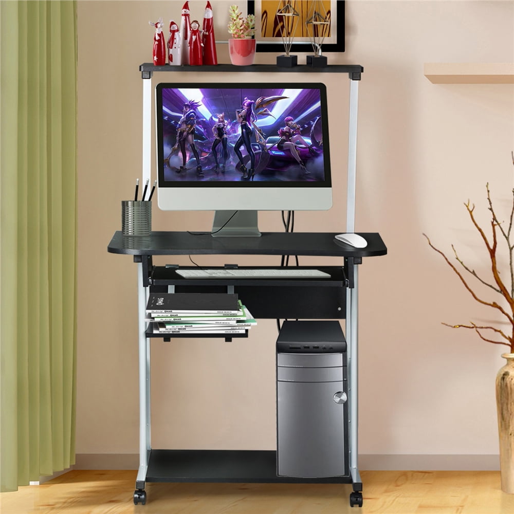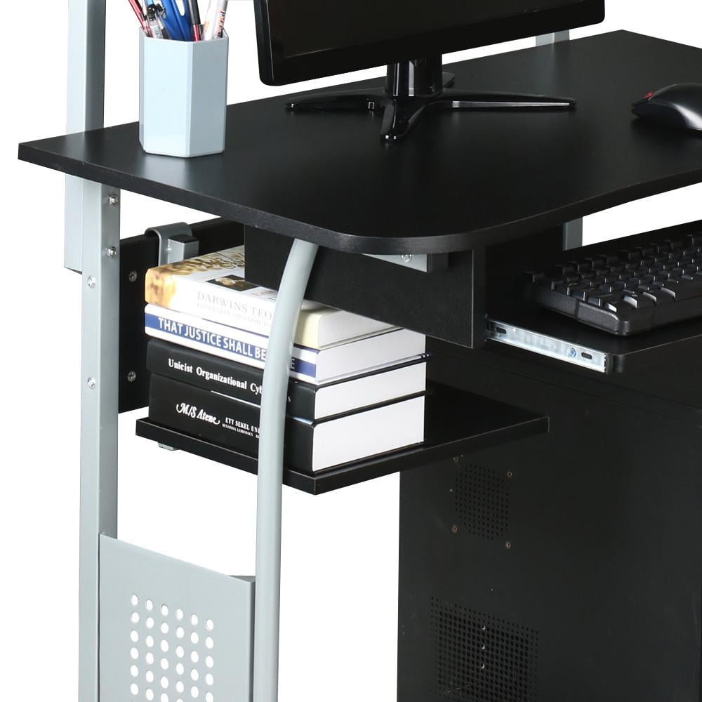Alden Design Metal Portable Computer Desk with 4 Storage Shelves and Keyboard Tray, Black/Gray: Movable and lockable Casters: The computer desk comes with four casters for smooth mobility, and two of them are lockable for easy stability. You can keep the computer desk as you need, no longer just placing the desk in the corner. Multiple Shelves for Various Storage: This black computer table has several tiers to meet your different storage needs. The top shelf can be used for placing small domestic printers or fax machines. There is a side storage rack for some small stuff, like notebooks, or disks. Plus, the bottom shelf is for mainframe CPU and other big items. Multilayer design is practical for you to store things neatly and orderly. Sturdy and Durable materials: This computer desk is made of durable and high-quality particle boards and iron tubes, which are sturdy and durable to use for a long time. Slide-out Keyboard Tray: The study desk for school and dormitory features a pull-out sliding keyboard tray, smooth to use. Beside the keyboard tray, there is a small rack for placing your frequently-used items, very convenient. Illustrated instruction for Assembly: If you are skilled and good at assembly, this will be quick and easy for you to put them together. If not, do not worry about the assembly. The computer tower shelf comes flat packed with detailed instructions. Modern Design: This desk is suitable for study room, reading room, dormitory or office. Stylish and fashionable design, as well as black and gray color of this computer tower shelf perfectly decorates your home and also adds a touch of modern charm to your study room. *Specifications: Color: Black + Gray Material: 15mm P2 Particle Board & Iron Tube with Coating Overall Dimension: 80x50x132cm/31.5×19.7×52” (LxWxH) Top Rack: 66x27cm/26×10.6” (LxW) Main Board: 80x50cm/31.5×19.7” (LxW) Keyboard Tray: 55×26.5cm/21.7×10.4” (LxW) Small Side Rack: 30x24cm/11.8×9.4” (LxW) Bottom Board: 60x39cm/23.6×15.4” (LxW) N.W.: 17.3kg/38.2lb G.W.: 18.5kg/40.9lb Note: Please allow 1-2 errors due to manual measurement.