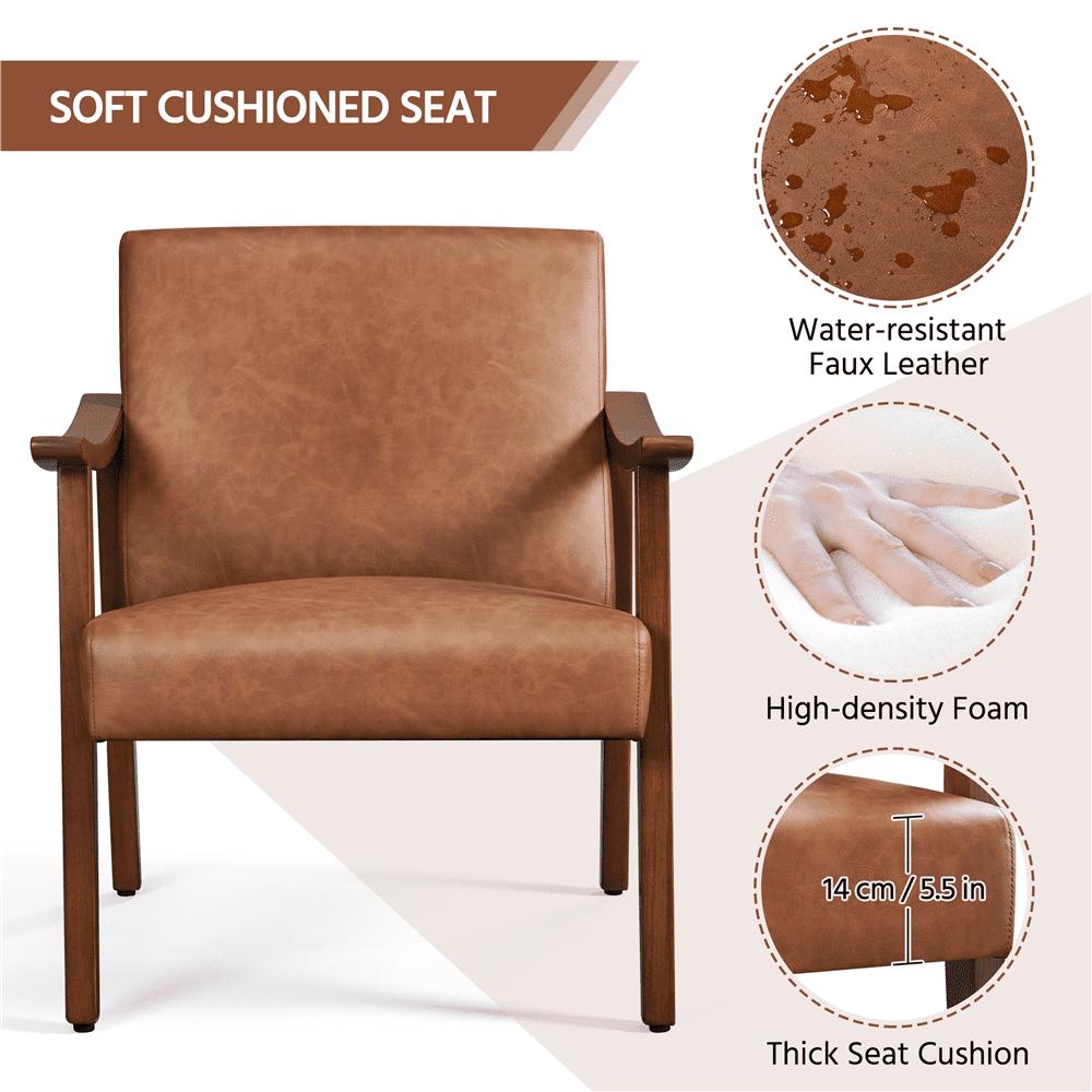 Want a piece to uplift your room This faux leather accent chair combines a mid-century modern style with a warm color tone, which will easily blend with any home decor. The brown leather upholstery complements the wood side frame and, bringing a charming and retro vibe to your room. The armchair features a solid wood & manufactured wood frame for excellent sturdiness and stability. With a cushioned seat and tilt backrest, you can comfortably sink in while relaxing. Plus, the low-profile design and extra-long armrest add an extra laid-back feel. A great addition to the living room, bedroom, office, or guestroom of your house or apartment.