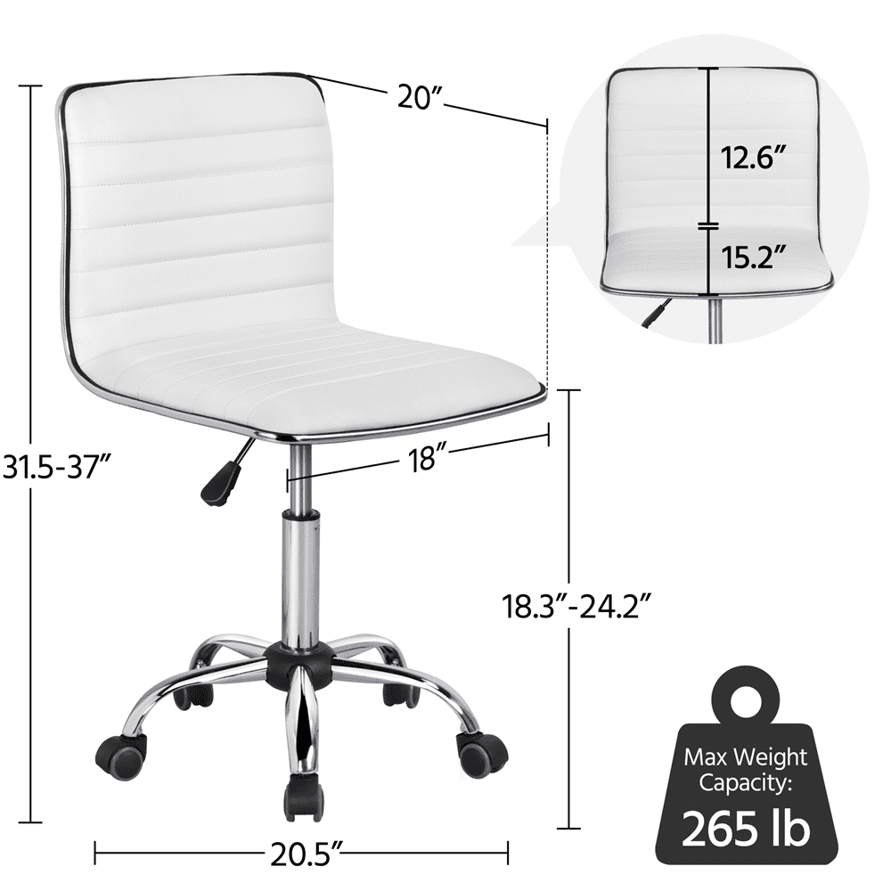 Alden Design Modern Adjustable Armless Faux Leather Swivel Office Chair, White Material: Faux Leather + Composite Board + Foam + Chrome finish Iron Overall Dimension: 19″ x 19″ x (31 – 36.6)” (L x W x H) Adjustable Seat Height: 16.3″ – 22.2″ SGS and BIFMA standard pneumatic gas mechanism for height adjustments Seat Size: 16.9″ x 17.9″ x 2.1″ (L x W x Thickness) Back Size: 14.8″ x 17.9″ (L x W) Max. Weight Capacity: 265 lb G.W.: 17.3 lb Package Size: 24″ x 11″ x 18.9″ (L x W x H) Packing List: 1 x Low Back Armless Chair and 1 x Instruction Easy to assemble: All parts, hardware, and instructions are included