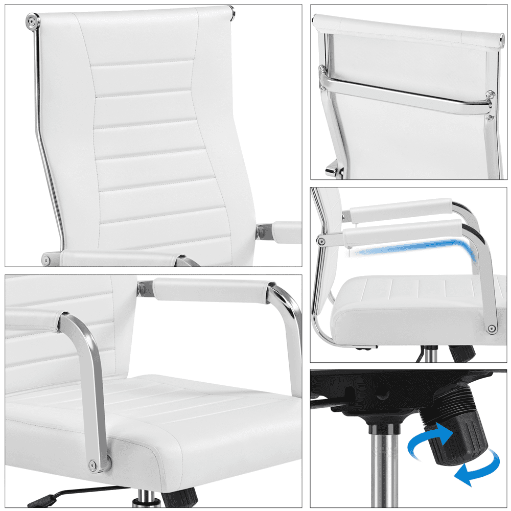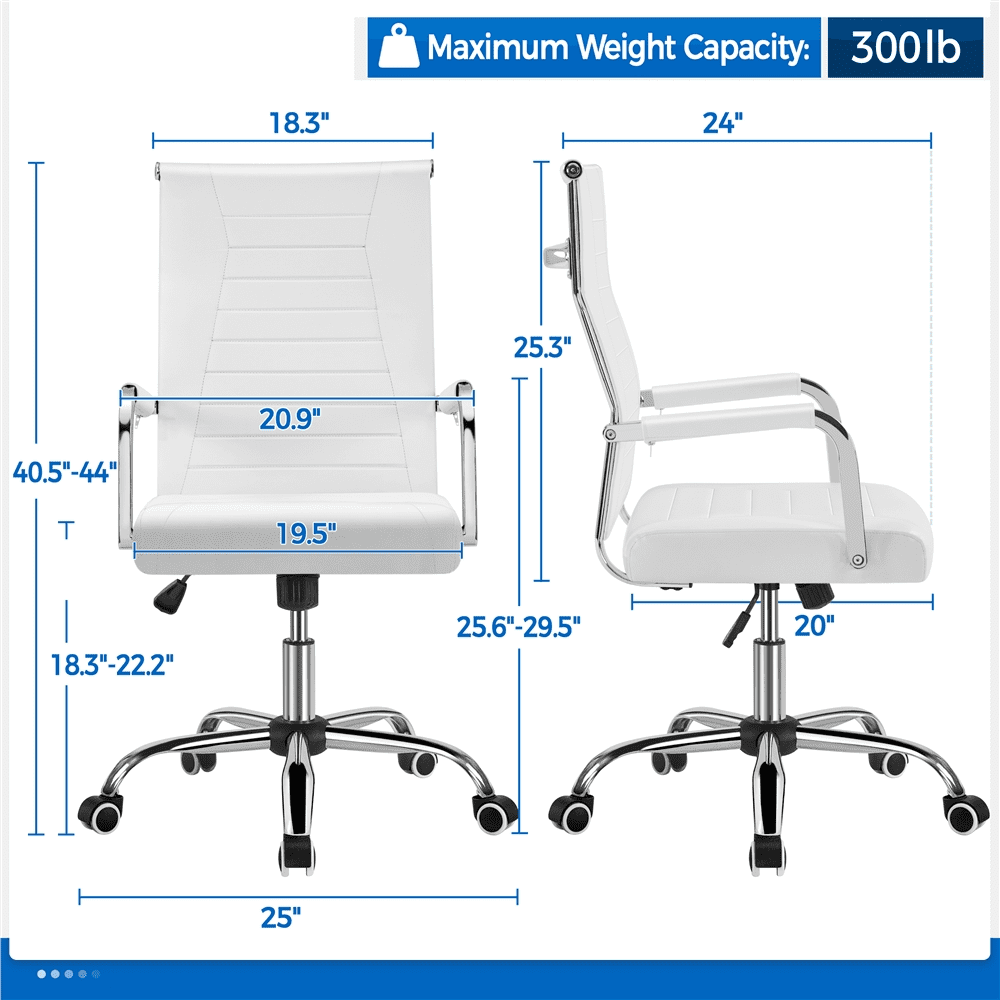 Smile Mart Modern Faux Leather Office Desk Chair with Mid-back for Home Office, White Materials: PU leather, Chrome-plated iron, Foam, Plywood, PP Color: White Overall Dimensions: 25” L × 24” W × (40.5-44)” H Adjustable Seat Height: 18.3-22.2” Armrests to the Ground: 25.6-29.5” Seat Size: 19.5” W × 20” D Maximum Weight Capacity: 300 lb Item Weight: 24.6 lb Shipping Weight: 29.8 lb Note: Please allow a 0.6’’ measurement tolerance. Ergonomic Curved Design Large Cushioned Seat