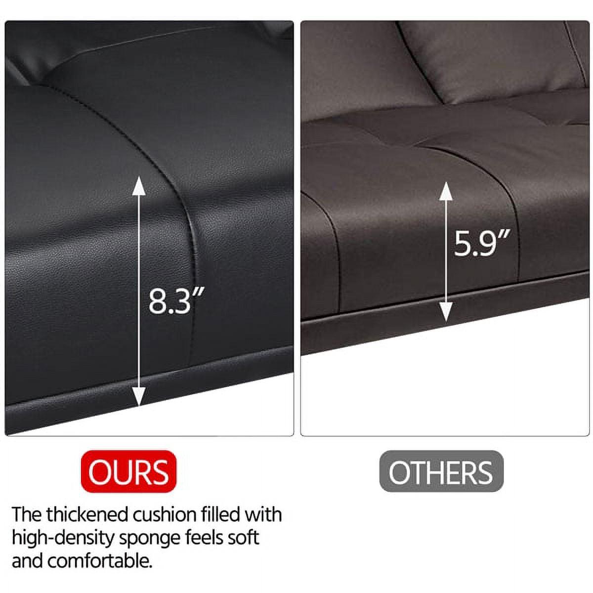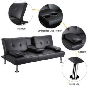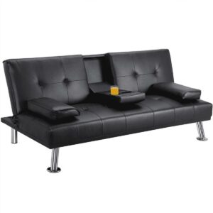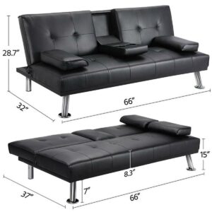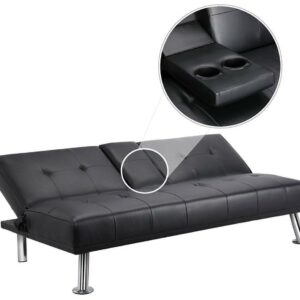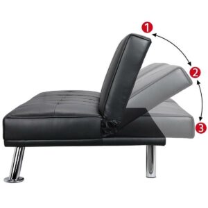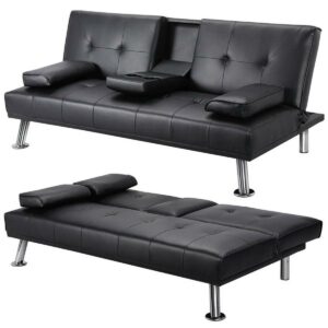 This futon sofa bed is made of high quality artificial leather and iron material. It is sturdy and durable to use. This home recliner couch can be transformed into a quick guest bed for visitors by removing the armrest and reclining the back rest. The futon sofa bed is designed for entertainment. The ergonomically designed sofa bed has a middle armrest that folds down with two cup holders, so you and your friend can relax and enjoy a couple of beverages. The sofa bed is perfect for small spaces and well-suited for any apartment, studio or college dorm, living room, bedroom, or den as an extra guest bed.