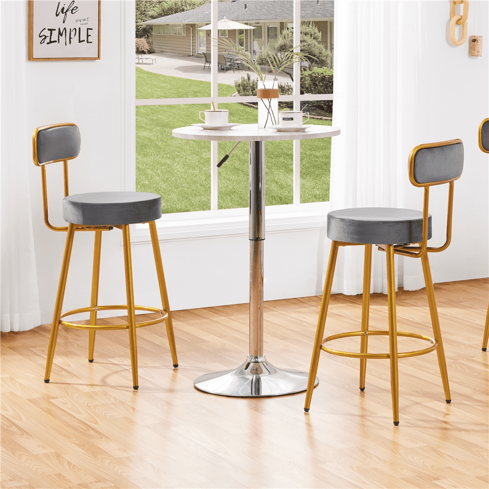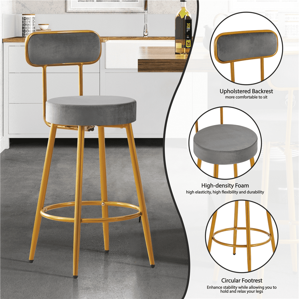 Smile Mart Modern Upholstery Velvet Bar Stools with Gold Legs, Dark Gray Color: Dark Gray Qty.: 2pcs Material: Velvet, Foam, Metal Assembled Dimensions: 15″ L× 17.5″ W × 36″ H Seat Diameter: 14″ Seat Cushion Thickness: 3″ Seat Height: 25.8″ Seat Back Height: 10.2″ Ground Clearance (from the footrest):9″ Max. Load Capacity (ea.): 300 lb Item Weight (ea.): 10.6 lb Shipping Weight: 23.6 lb Note: 1. Please allow a 0.5″ measurement tolerance. 2. For your safety, please do not stand on the stool. 36″ H Extra-tall Bar Stool Modern and Luxurious Style