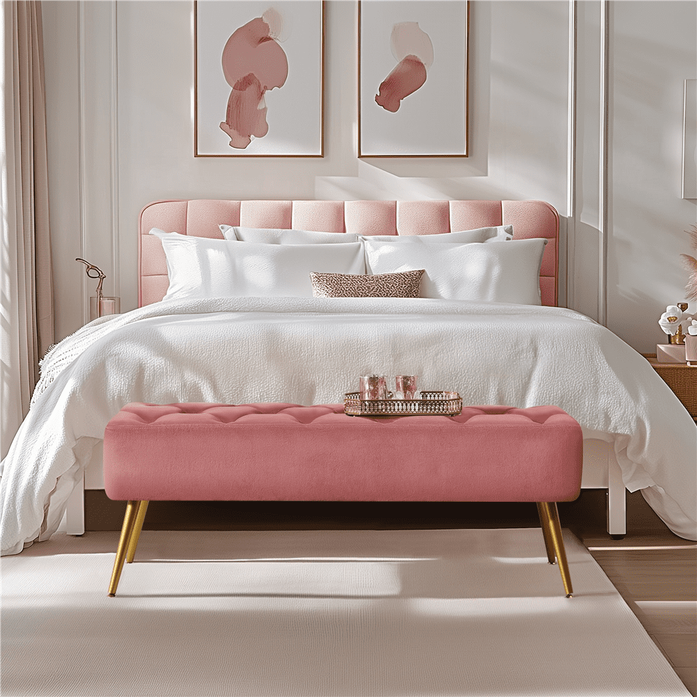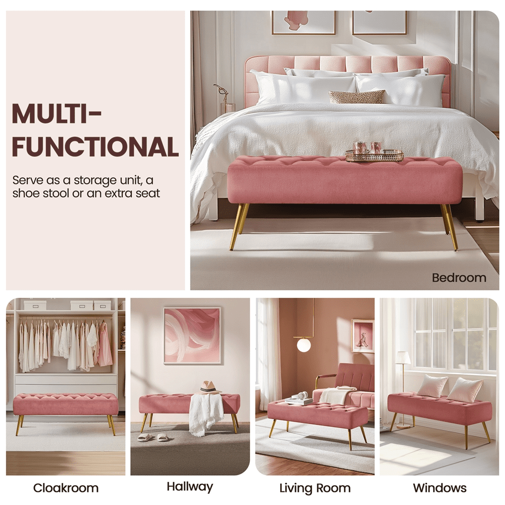 SmileMart Modern Ottoman Velvet Footstool Bench for Bedroom, Pink Materials: velvet, foam, plywood, metal Colour: Pink Overall Dimension: 45 × 16 × 17’’ (L × W × H) Overall Weight Capacity: 300 lb G.W.: 23 lb N.W.: 18 lb Note: Please allow ± 0.5’’measurement tolerance.