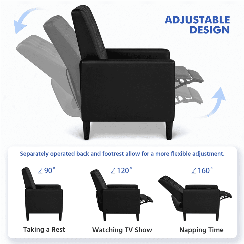 Boasting a clean-lined design, button tufting and smooth faux leather upholstery to blend well with any room style, this manual recliner is the perfect addition to your home. Founded atop 4 tapered legs, this reclining sofa features a sturdy wooden frame, foam fill, and skin-friendly faux leather upholstery that is easy to clean. This smooth reclining mechanism allows you to sit up straight, or sit with your legs up, or take a day nap in a fully reclined position. The footrest instantly pops up by simply pushing at the backrest and stops at any angle from 0 to 90 degrees. Measuring 26.5″ W × 32″ D × 40.5″ H, this compact faux leather recliner fits easily in narrow nooks and limited spaces like small living rooms, bedrooms, dens, offices, and more. Simple assembly is required.